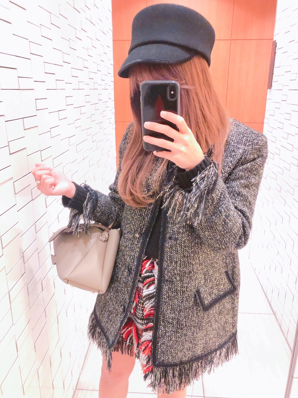 グレー系のジャケット/アウター、レッド系のスカート、ブラック系の帽子を着用したレディースの春コーディネートの1枚目の写真