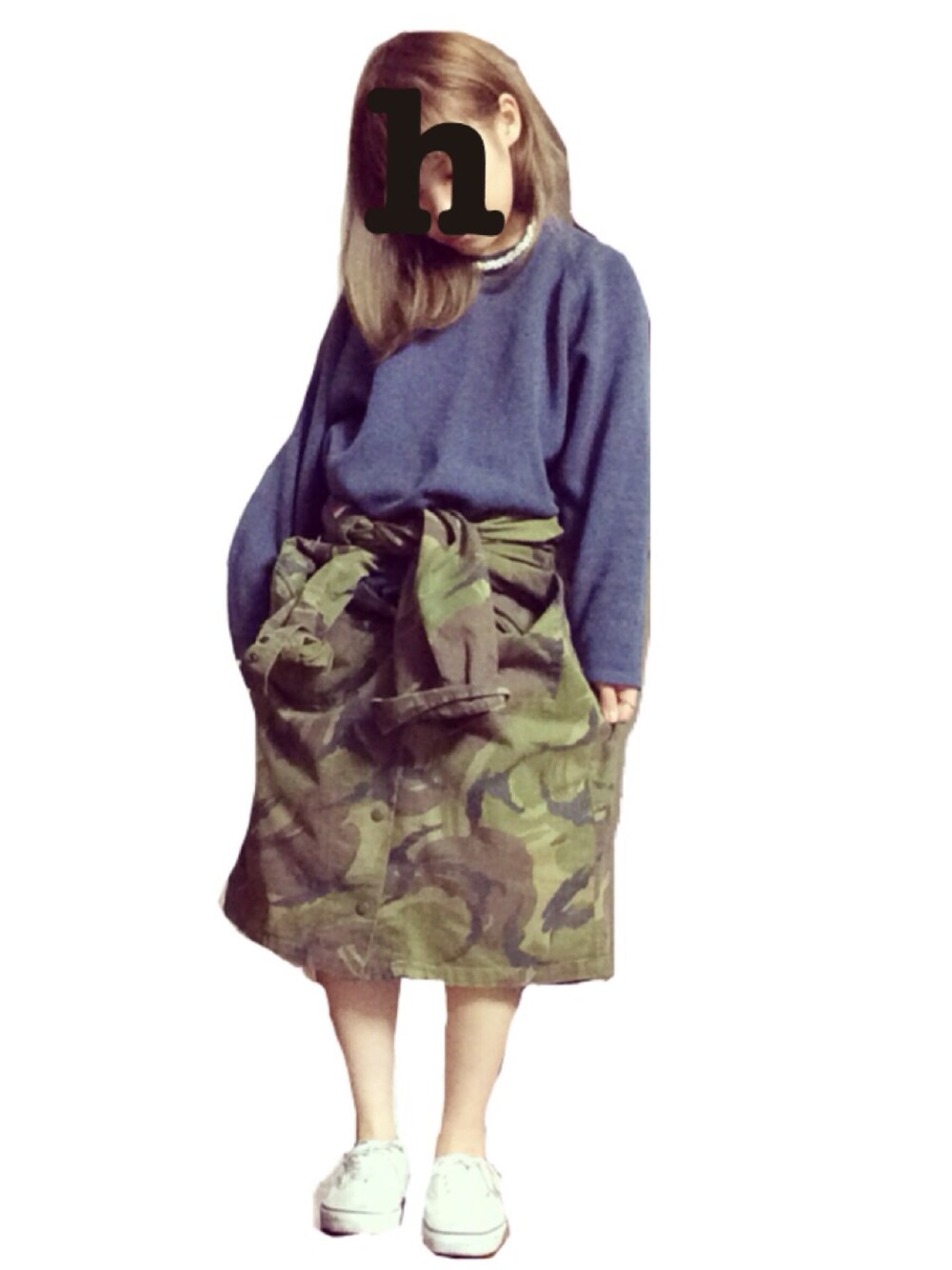 カモフラのオーバーサイズアウターを スカートとして穿きました 笑 (だってカモフラスカートもってないもん) スウェットもオーバーサイズ。 個性的なシルエットになりましたとさ。 カジュアルすぎたのでパールネックレスさま。 お金なくてお洋服買えないので 必死なんです。 アシスタントのうちは我慢ですねー。