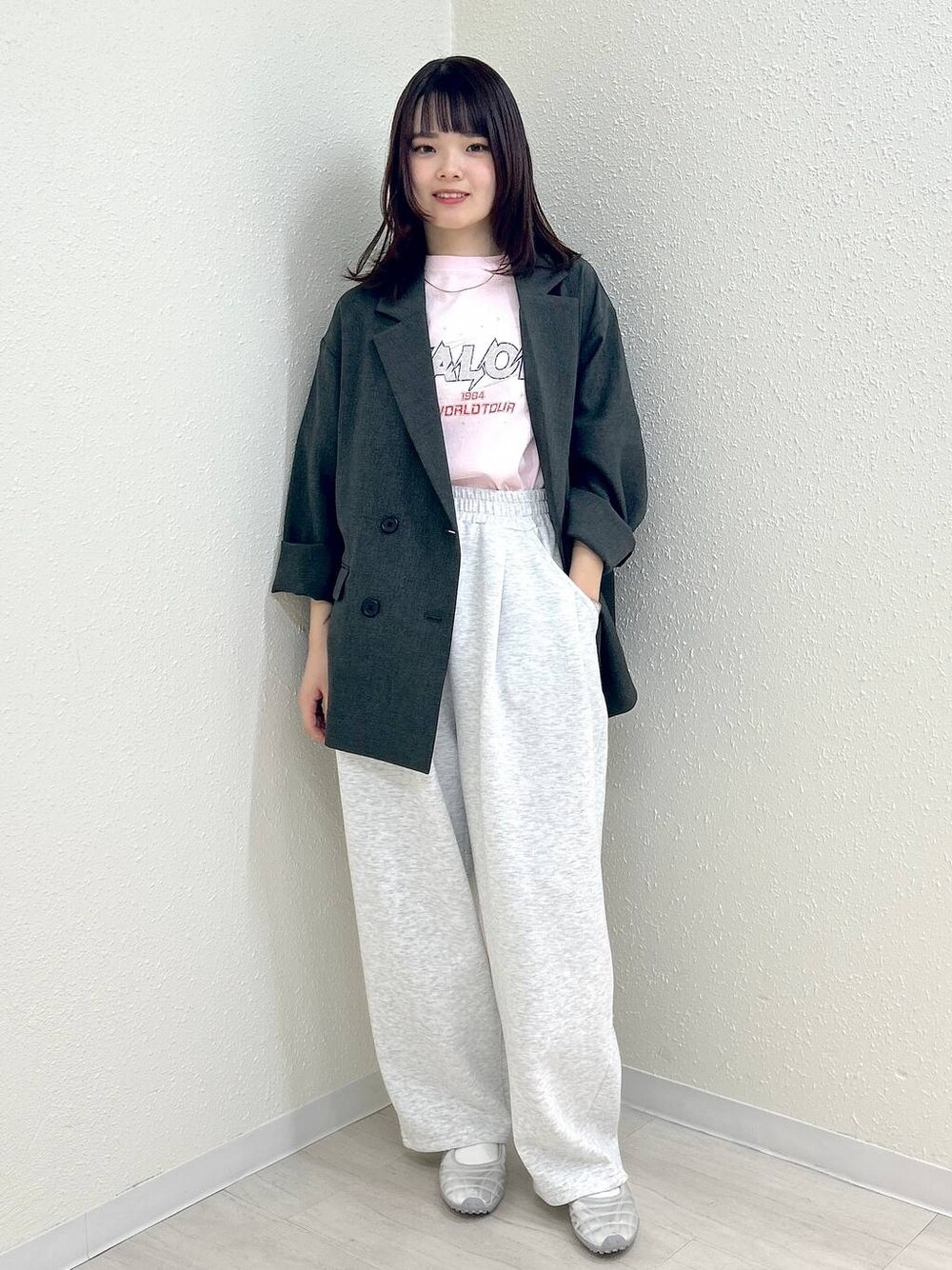 人気のTシャツコーデ🩷 ジャケットはお洗濯もできて シワにもなりにくいです! ボトムスは とっても人気のアイテム☆ トレンドのコクーンシルエットで ジャージ素材でも綺麗めに着ることができます★