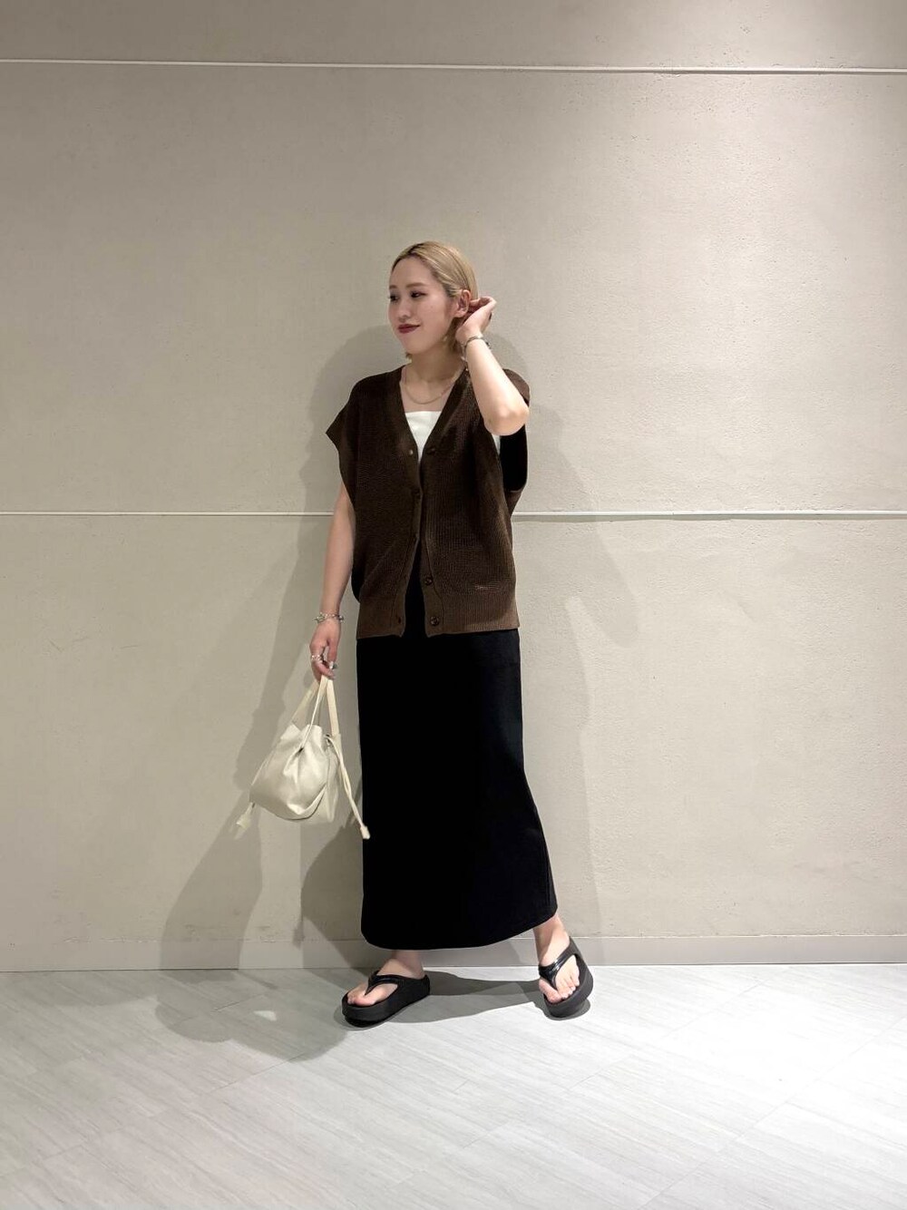 ベストは新作ですが今すぐ着用頂けるアイテムで キャミソールと合わせています◎ ゆったりとしていてお袖口も広いので 秋までレイヤードを楽しめます♪ スカートはIラインのストレートシルエットで ストレッチが効いていて履き心地抜群です!