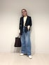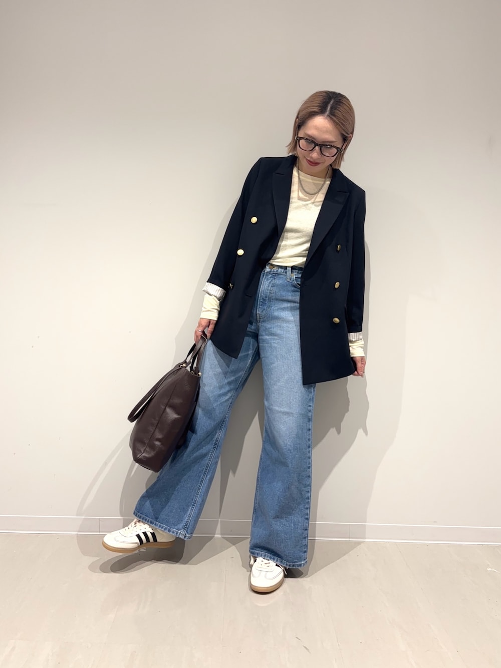 【ジャケット】 ジャケットは元々好きですがこちらはサイズ感とシルエットがダントツでいいです!◎ 肩周りはジャストで着丈はお尻がちょうど隠れる長さになっておりスッキリ着用できます! シワにもならないのでお手入れも楽ちんです♪ インナーはシンプルなシアーTですがジャケットのゴールドボタンがアクセントで華やかになります! 【デニム】 別注のLeeデニムです!ワイドストレートで太すぎないシルエットが綺麗です!サイズはSを着用でウエスト、長さ共にジャストです。春に向けて明るいカラーが気になります♪ 【スニーカー】 レザー調のデザインで型止めなので中々手に入らないレアアイテム。履くだけでオシャレを格上げしてくれます!◎