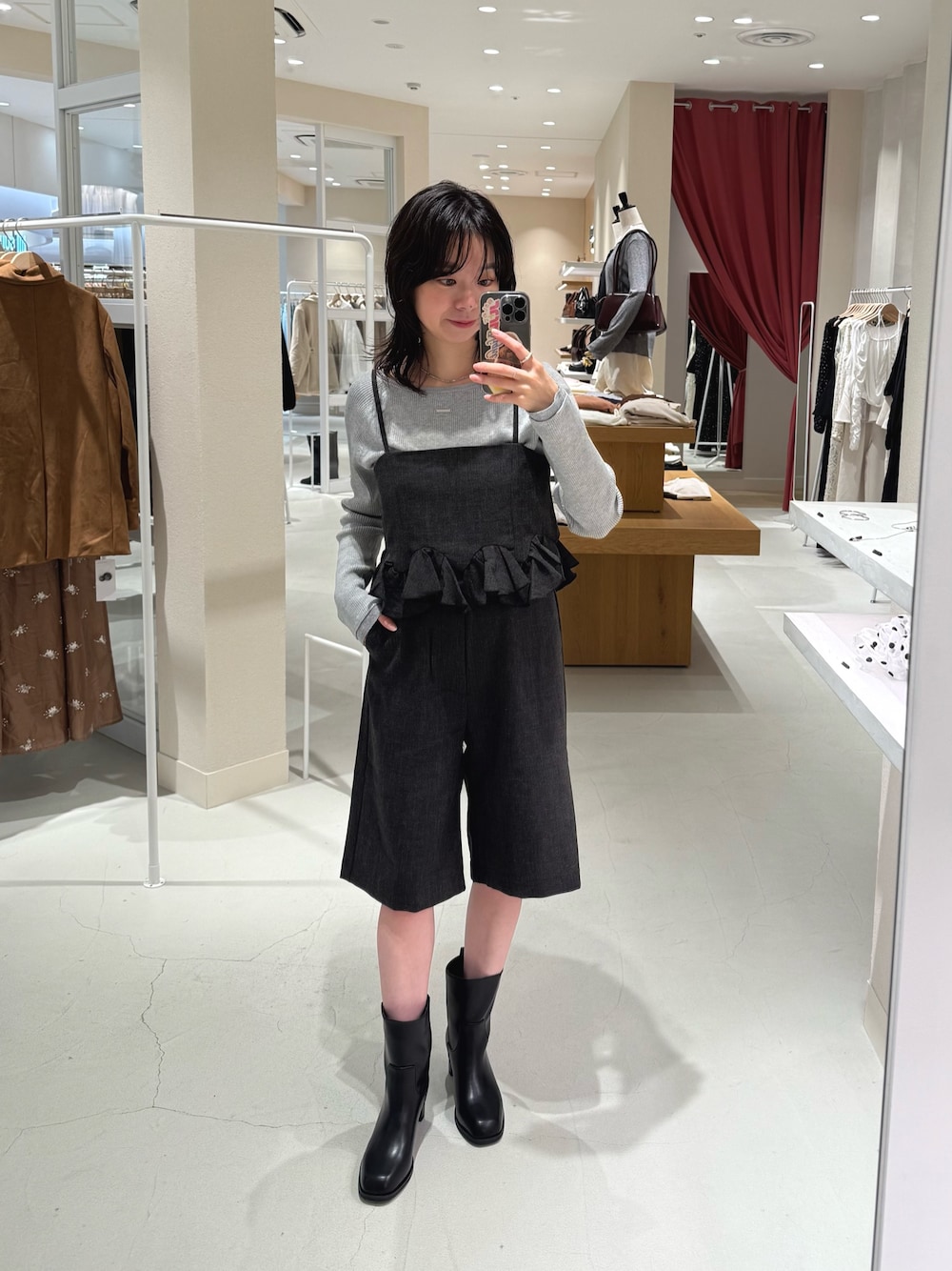 ウェーブフリルビスチェをセットアップで着ました! これだけでおしゃれ見えします^^ 難しそうに見えるハーフパンツは ヒールのショートブーツを合わせると 取り入れやすいですよ◎