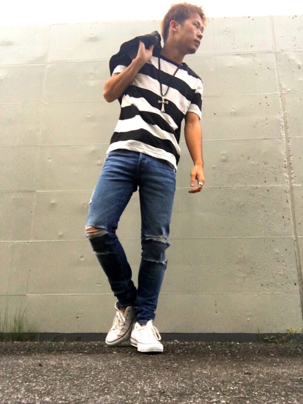 みなさんこんにちは〜 チビだけどお洒落したい19歳yu✂︎です👍 ここ最近、中々アップしていませんが 本当に申し訳ありません…。 コーデを撮るタイミングと 暇があまり無いので 中々更新出来ませんでした😂🙏 で、今日は少し早めに 爽やかなサーフ系をイメージして ボーダーのビックTに クラッシュデニム そして、流行りのコンバースを 履いちゃいました👍👍 もう気づけばアウターもいらない時期になり 昼は暖かく、夜はまだ肌寒く、と 調節が難しい時期ですが そんな時期は着るか脱ぐかで 対処するしかないですよね😂🙏 とまあ、今日はこんな感じで ダーツのリーグ戦へ行ってまいります❗️ 絶対勝つ❗️❗️❗️❗️❗️❗️ ではでは、 フォロワーの皆さま✨いつも いいね👍 save💽 コメント📝 ありがとうございます😂🙏 できる限り、毎日更新していくので これからもよろしくお願いします❗️❗️ コラボやリクエストコーデも 受け付けておりますので コラボしてみたい方! リクエストコーデさせてみたい方! お気軽にコメント欄へどうぞ〜👍 ✨新規の方々✨ よかったらFollowしてって下さいね👍 また遊びに来て下さい🚗 お待ちしております❗️❗️