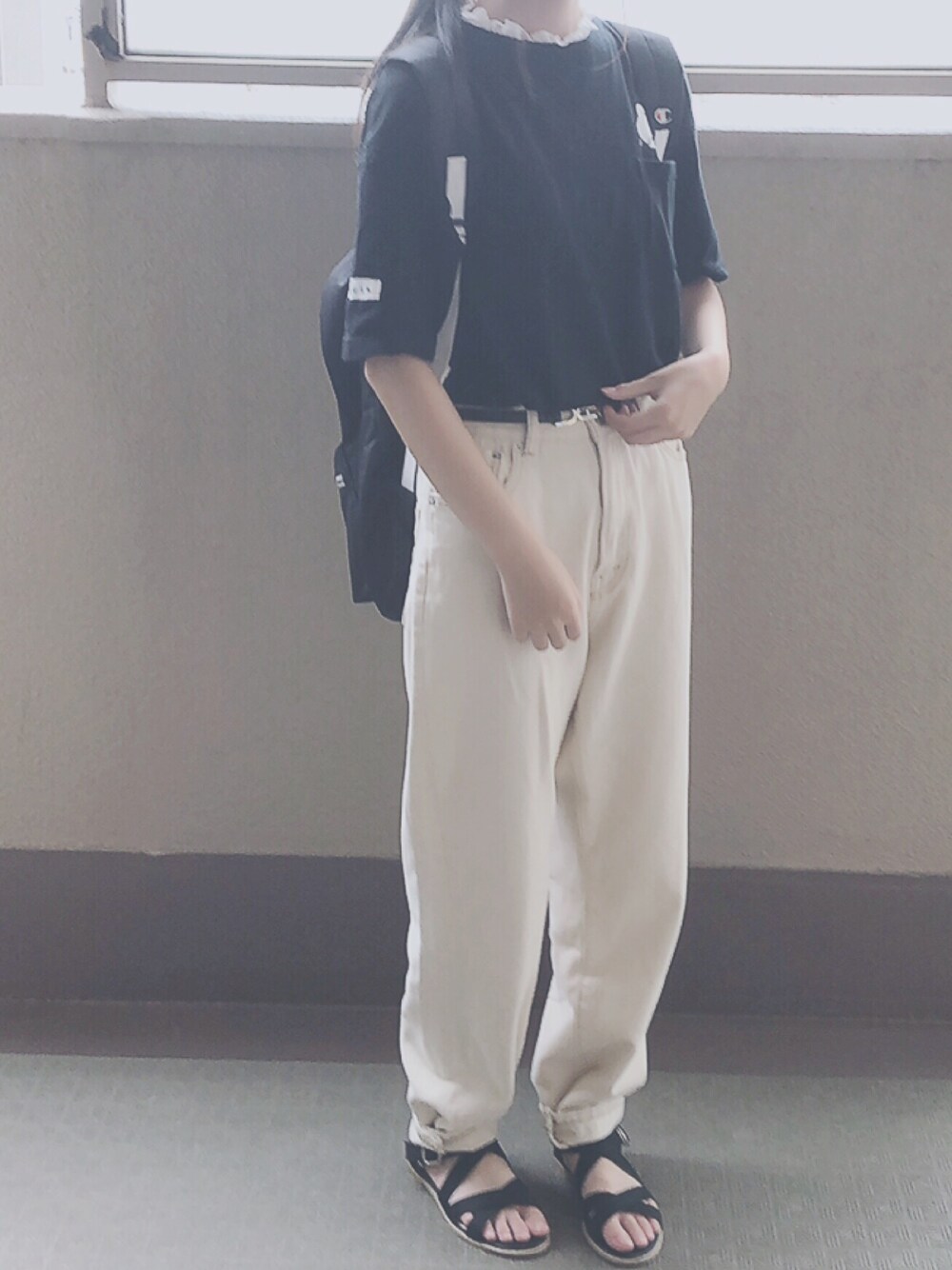 黒と白のシンプルカジュアルなかんじにしてみました🐼 ボトムは裾を少し縫ってるので、本来のシルエットとは少し違います🙌