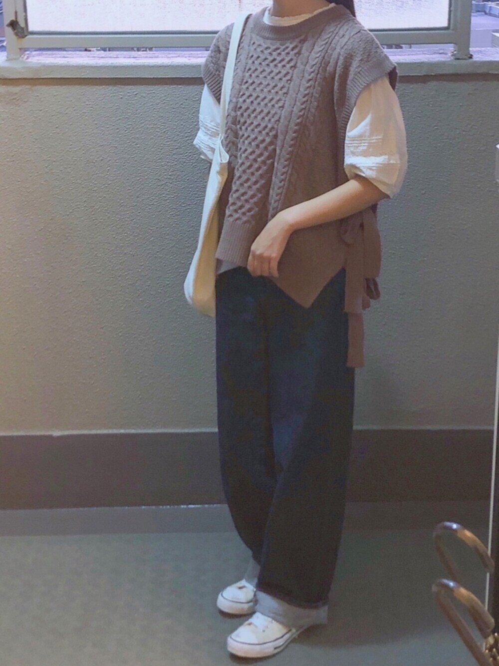 ねこのベスト「アランリボンニットベスト」を使ったコーディネート