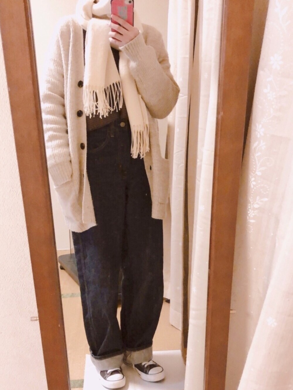 シンプルカジュアルなコーデにしてみました🐼 見えてないですがニットの中からブラウスをチラ見せしてるのもかわいいです❄️ ストールマフラー初めて買ったのですが、すごい暖かいです😊