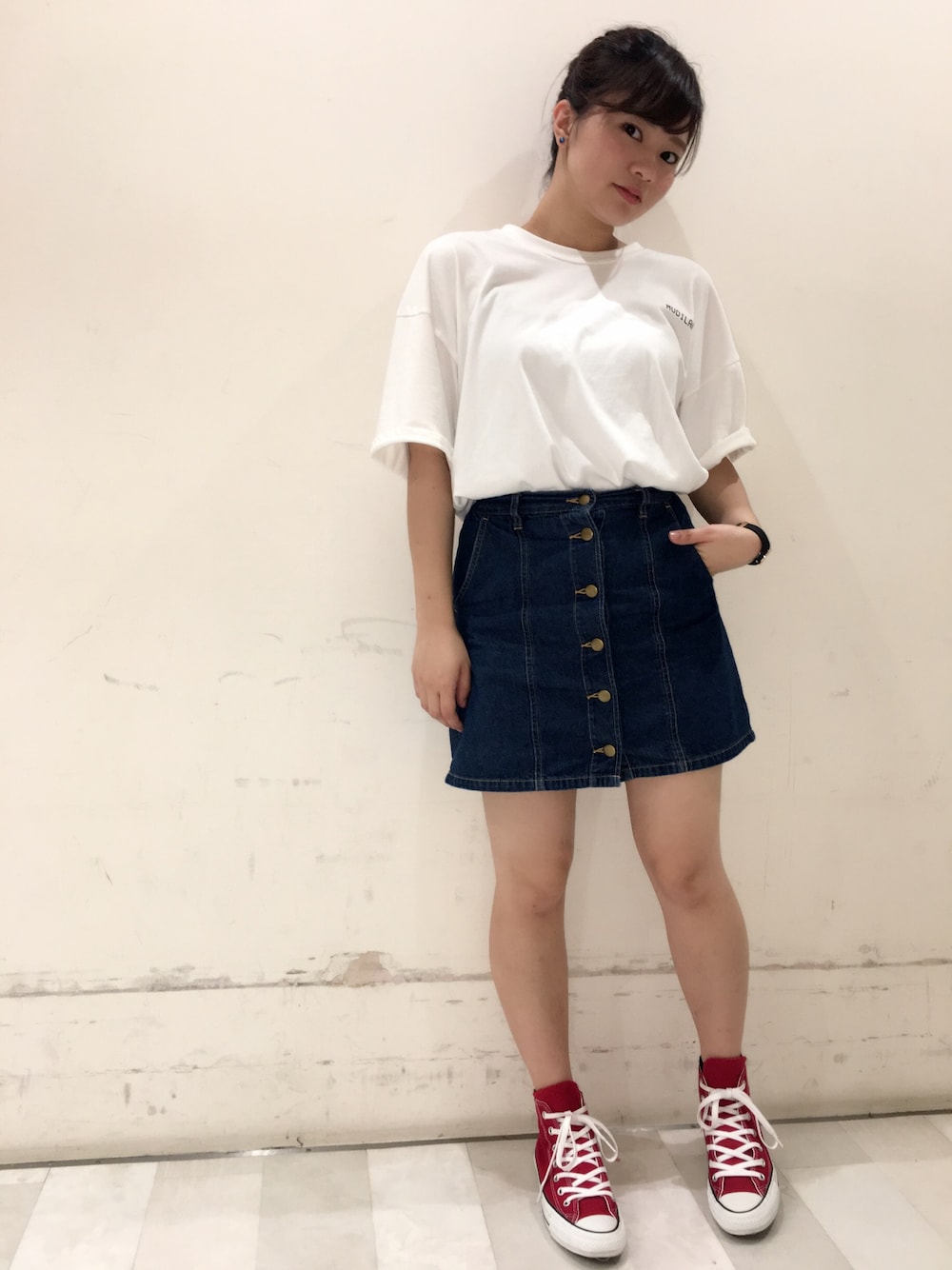 ヤオのデニムスカート「WEGO/前ボタン台形スカート」を使ったコーディネート