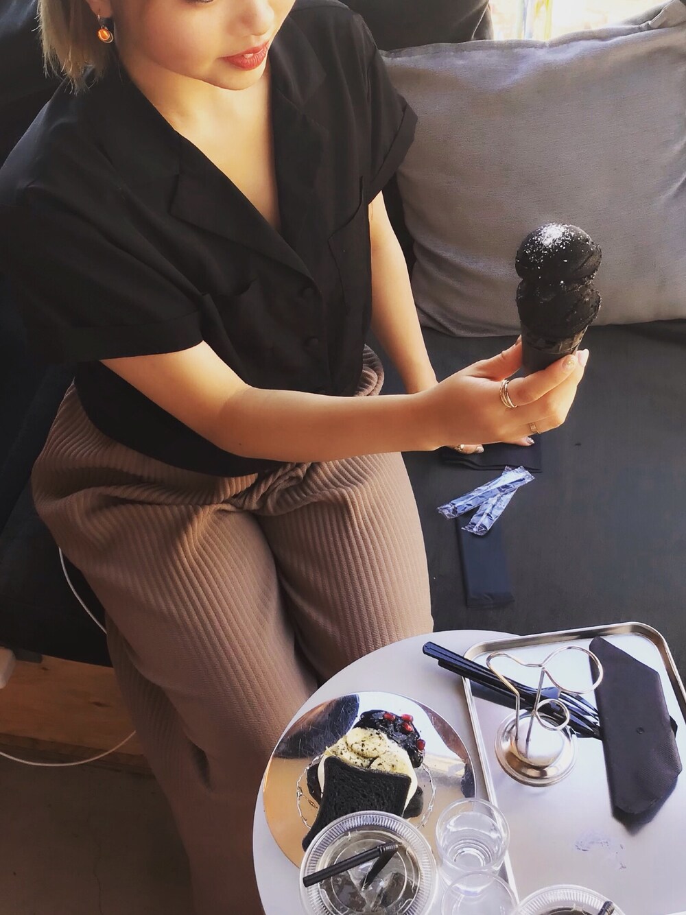 Book and Bed TOKYOにいってきました なにもかも映えてた!! カフェラテもスイーツも真っ黒!! でもかっこよかった!!!! あっつい日だったのでやっぱりラフなコーデ笑