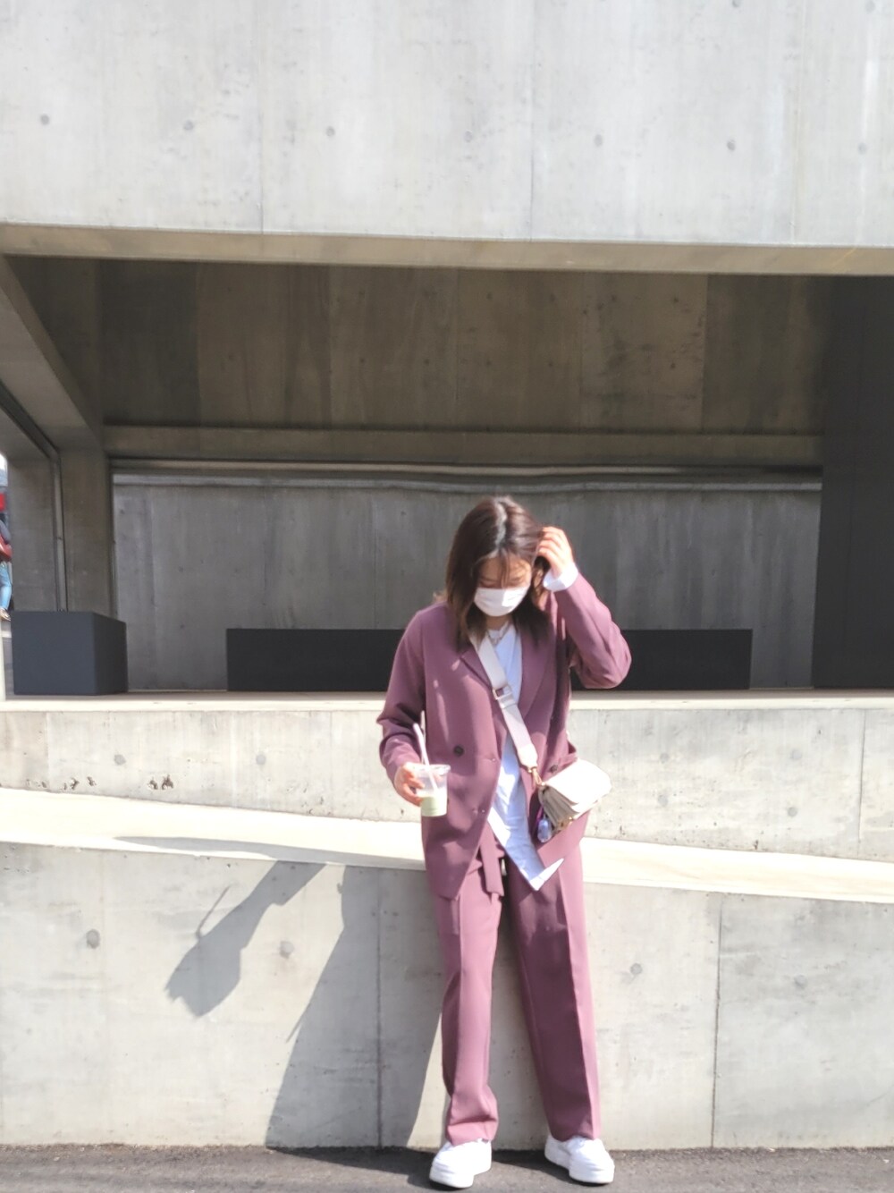 春だからピンクのセットアップ( 〃▽〃) 変形トップスあわせてスニーカーが浮かないカジュアルな感じに