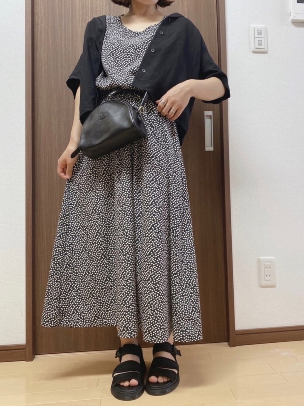 オールブラックコーデ ワンピはドット柄っぽく見えるけど白い小花柄 個人的に花柄はダークトーンでまとめたくなります