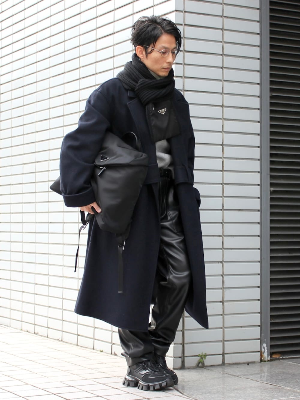 kudosのロングコートは上品な印象でお気に入り。レザーパンツと合わせてMIX感を楽しみました。