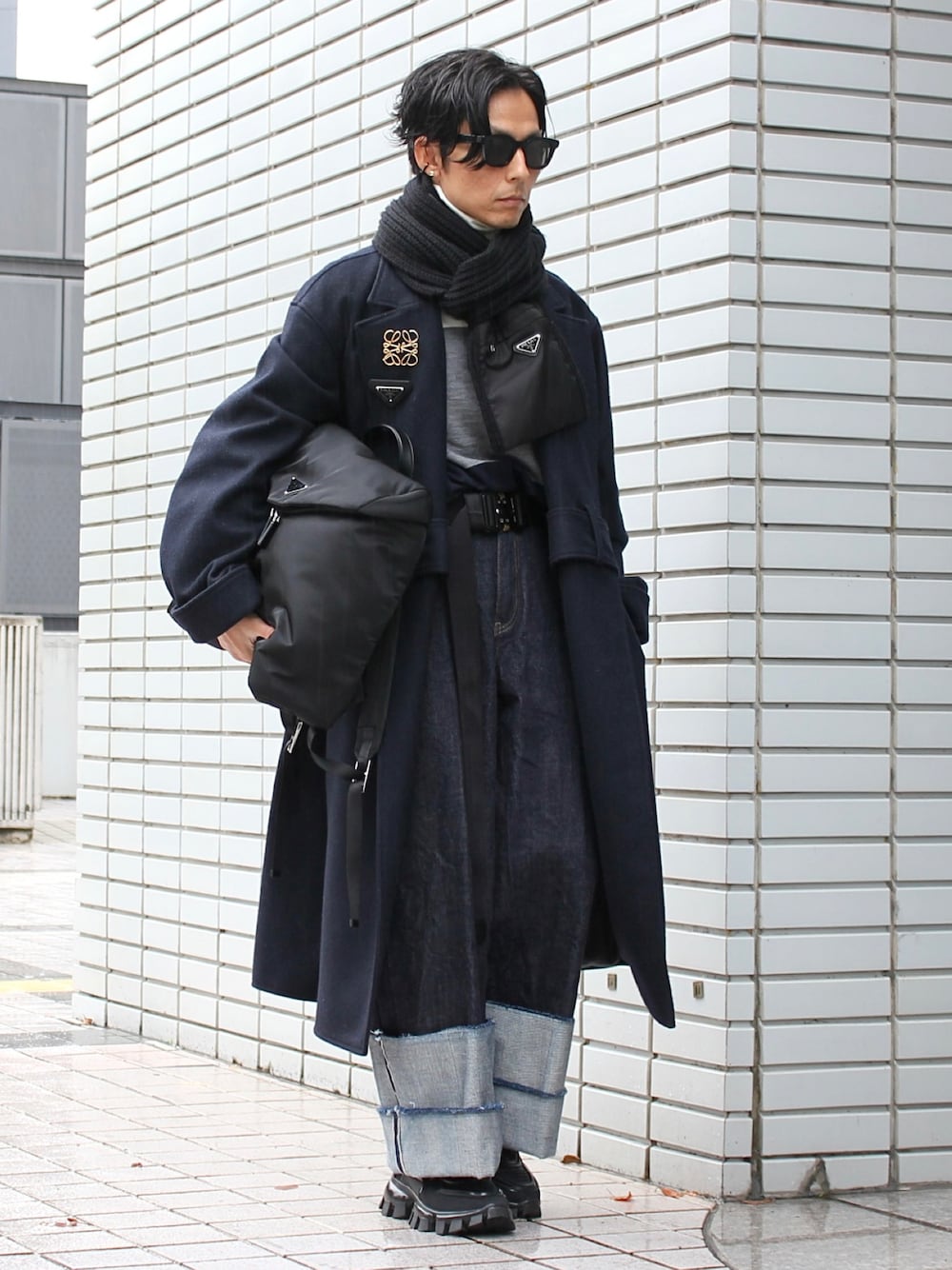 [周りと差がつくリュックの持ち方] リュックといえば "背負う" のが 一般的な持ち方ですが、 今回のスタイリングのように 脇に抱える"クラッチバッグ持ち" をしてあげると、 一発で新鮮でハイセンスな 着こなしに仕上がります。 「そんなのアリなの?」 と思うかもしれませんが、 この着こなしテクニックは PRADA 21-22AWコレクションルックで 披露されていたものなので、最先端! この持ち方をすると腰回りにボリュームが 生まれることによって、 着こなしの重心位置が上に上がるため、 スタイルアップが図れる点もメリットです。 特にneederのような低身長の方には より効果の高い着こなしテクニックですので、 ぜひ、取り入れてみてください。 リュックは背負うだけじゃ、ないんだせ(笑) 私の推しブランドは「kudos」 このコートは良い意味でkudosっぽくないクラシックな雰囲気が気に入っています。 ……………………………………………………………… コート:kudos ニット:UNIQLO+J デニム:LIVINGTONE スニーカー:PRADA サングラス:CELINE マフラー:PRADA ブローチ:PRADA LOEWE バッグ:PRADA イヤカフ:CHIEKO+ needer / 165cm / 57kg ………………………………………………………………