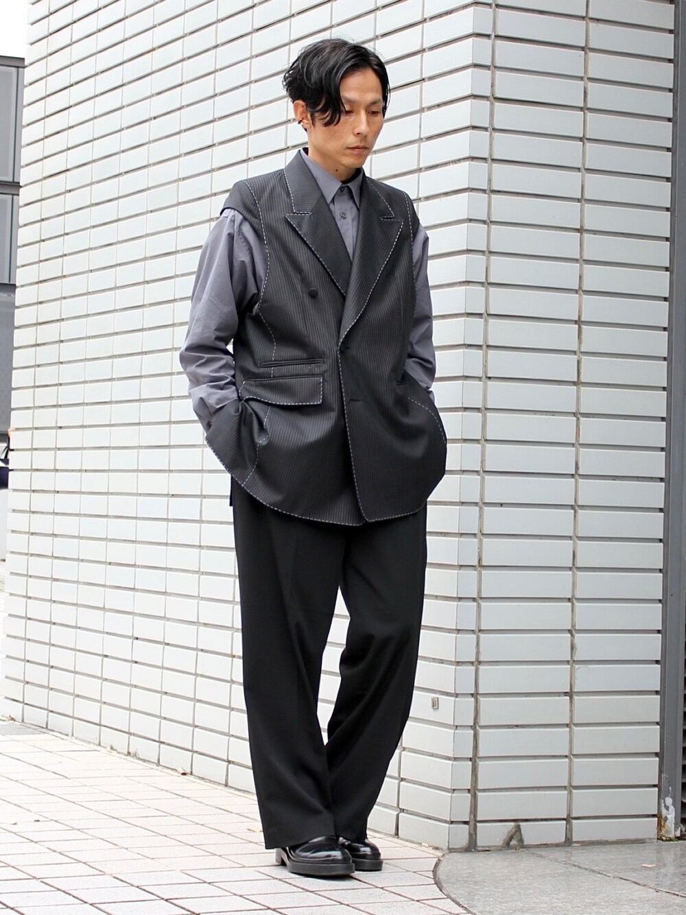 [ベストはインナーとの色差を無くすと自然に馴染む] ここ最近、レディースを中心に人気を集めている ノースリーブタイプのジャケット。 ジャケットの形をしていながらも、 ごそっと袖の無いデザインは とても新鮮で面白い印象を与えてくれます。 あまり見慣れないアイテムであるが故に 難易度が高いように感じるかもしれませんが、 まずはベストとインナーを 同色もしくは似ている色を合わせてあげると、 意外と簡単に自然な感じで馴染んでくれます。 今回のスタイリングでは ベストもシャツもグレーを選んで 色を統一しつつも、 同じグレーでも濃淡を付けることで 着こなしに奥行きを持たせて 洒脱さを加えました。 袖の無いジャケット、一度着ると その面白さにハマってしまう中毒性があるので、 ぜひ、取り入れてみていただきたいです! ……………………………………………………………… ジャケット:soduk シャツ:ALLEGE パンツ:UNIQLO シューズ:PRADA イヤカフ:CHIEKO+ needer / 165cm / 57kg ………………………………………………………………