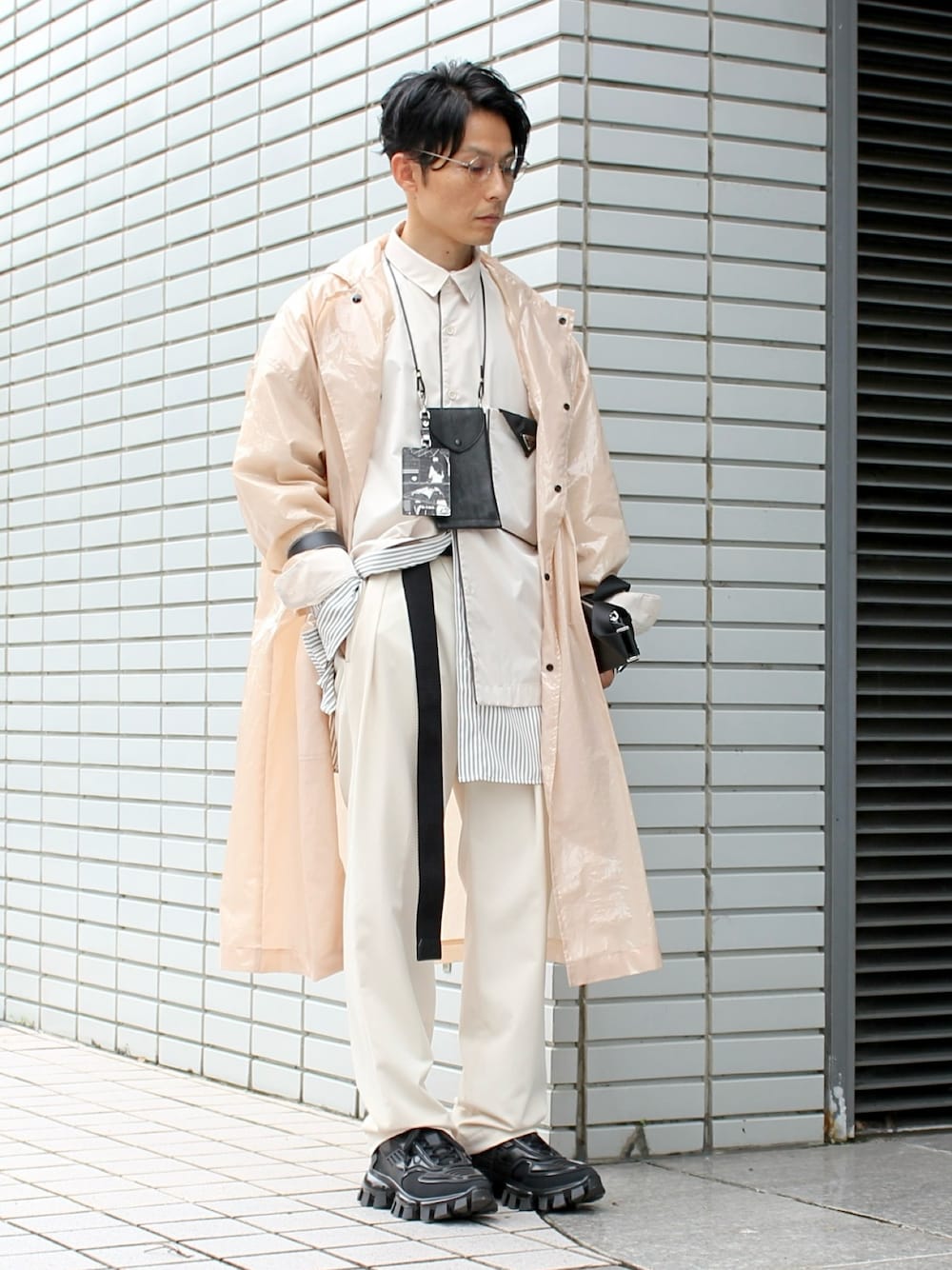 [春色コーデは黒で引き締めてメリハリを付ける] 珍しくピンクをメインにした 春色コーディネートを作ってみました。 メンズでピンクを着るのは なかなかハードルが高かったりするので、 ホワイトに近い色合いのピンクを 選んであげるのが最初の一歩にはオススメ。 こういった明るい色味を使った春色コーデでは 随所に黒を差し込んであげて、 着こなし全体を引き締めてあげると、 メリハリが付いてオシャレに見えます。 特に、手首・足首などの体の先端部に 黒を配置してあげると引き締め効果抜群。 靴・バングル・腕時計・バッグなどで 黒を取り入れてあげると上手く整います。 ……………………………………………………………… コート:jieda × renoma シャツ:STYLEMIXER スラックス:STYLEMIXER スニーカー:PRADA バッグ:PRADA アイウェア:金子眼鏡 バングル:LOEWE バッグ:PRADA ポーチ:soe needer / 165cm / 57kg ………………………………………………………………