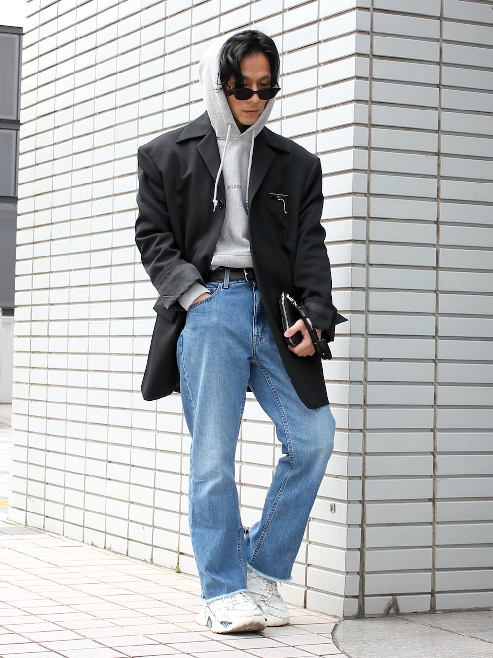 ジャケットスタイルの変化系として インナーにパーカを合わせるのは定番の一つ。 大人っぽさがありながらも 遊び心がプラスできるので、 ほどよいカジュアルな印象に 仕上がるのが良いですよね。 今回はジャケット×パーカでやってみたかった フード被りにチャレンジ。 BALENCIAGAのコレクションルックを参考に パワーショルダージャケットに 細めのサングラスを合わせて、 モードな要素を加えてみました。 パーカの裾を内側に折り込んで、 タックイン風に見せることで、 スタイルアップも狙っています。 実際にやってみて感じたことは、 フードにある程度の大きさが無いと、 ちんちくりんな印象(笑)になるので、 注意が必要です! 今回のパーカはフードがやや小さめだったので フードを少し後ろにズラして被ることで 見た目のバランスを整えました。 やっぱり何事も実際にチャレンジするからこそ 学べることがたくさんあると改めて感じました! ……………………………………………………………… ジャケット:YUKIHASHIMOTO パーカ:assaisonner. デニム:UNIQLO and JW Anderson ベルト:soe スニーカー:CalvinKlein205W39NYC ミニバッグ:soe × yosemite アイウェア:A.D.S.R needer / 165cm / 57kg ………………………………………………………………