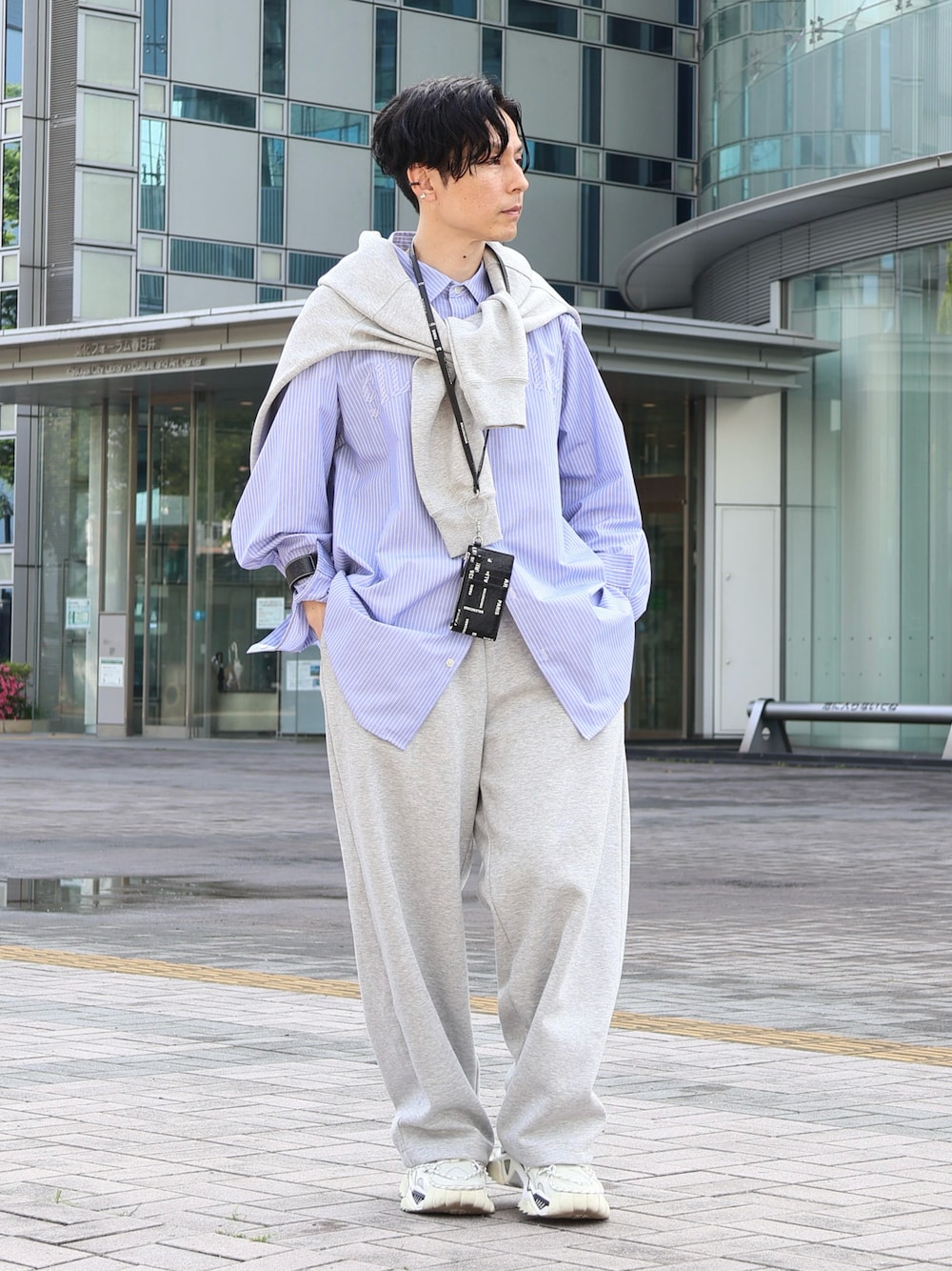 上下スウェットスタイルは 快適で動きやすいし、ストレスフリーなので、 個人的に好きな着こなしの1つです。 ただ、そのまま着てしまうと、 部屋着感が漂ってしまうので、 着こなしでカバーしてあげる必要があります。 以前も紹介させていただきましたが、 こういう部屋着感のあるアイテムには、 カッチリした印象のあるシャツを 合わせてあげると街着として成立します。 特にこの時期には トップスのスウェットを肩巻きして シャツを全面的に見せつつ、 セットアップ風な印象を残してあげた スウェットスタイルが面白いと思います。 スウェット×シャツの法則 とってもオススメです! ……………………………………………………………… スウェット:UNIQLO:C シャツ:UG スニーカー:CalvinKlein205W39NYC カードケース:BALENCIAGA needer / 165cm / 57kg ………………………………………………………………
