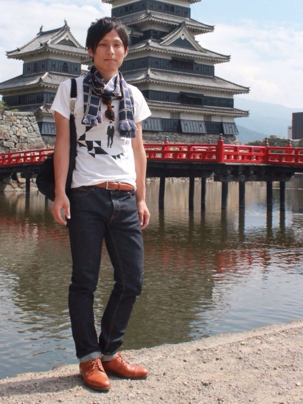 白Tシャツにデニム シンプルな合わせなので チェック柄のストールをアクセントに 足元はやっぱり革靴 重くなりすぎないように カラーをキャメルに これによって コーディネートに軽さが加わります