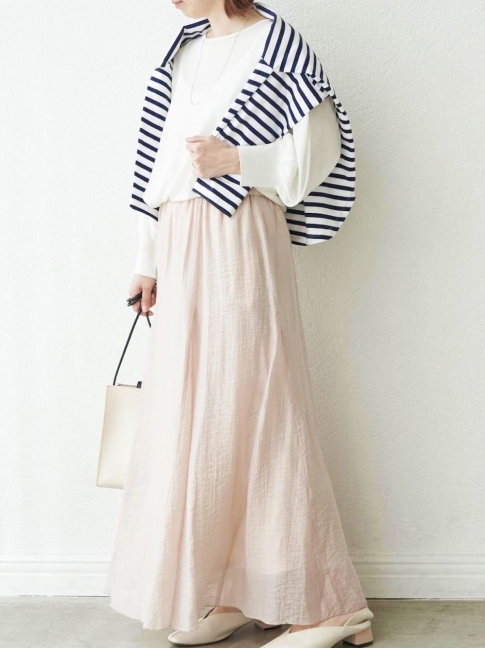 ボーダーでカジュアルさをプラスしたスカートコーデ ふんわりシアースカート×トップスの甘さのあるスタイルに、ボーダートップスを肩掛けしてカジュアルさをプラスしました。 スカートは少し甘めのベージュ系カラー。 身長154cmで長めですが、軽さのある素材でどのカラーもおすすめです!