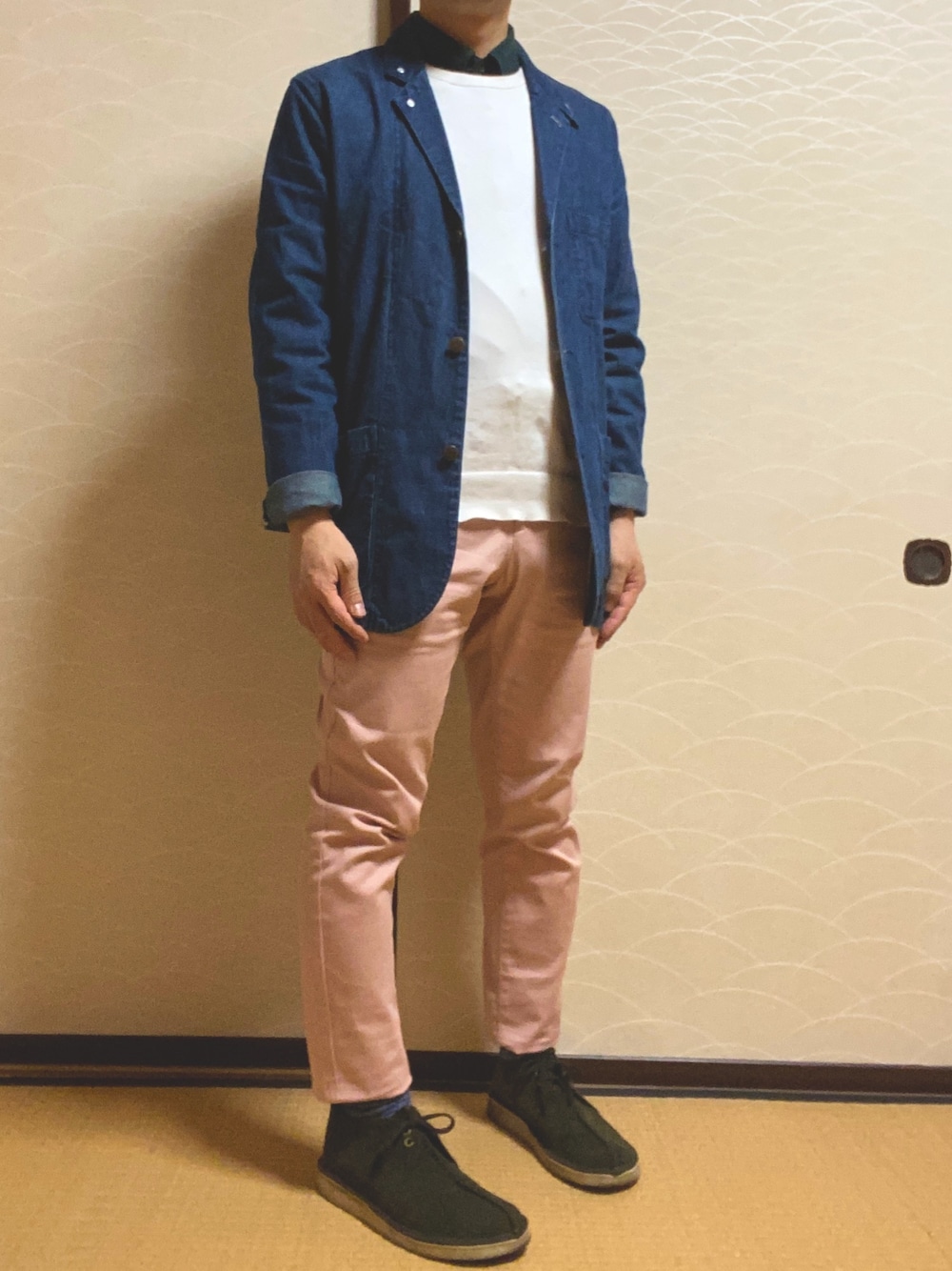 今日は暖かくなるようなので、ちょっと冒険して春らしくピンクのパンツを履きました! インナーとシューズはグリーンで合わせて、薄手の白セーターとデニムジャケットを着ました!