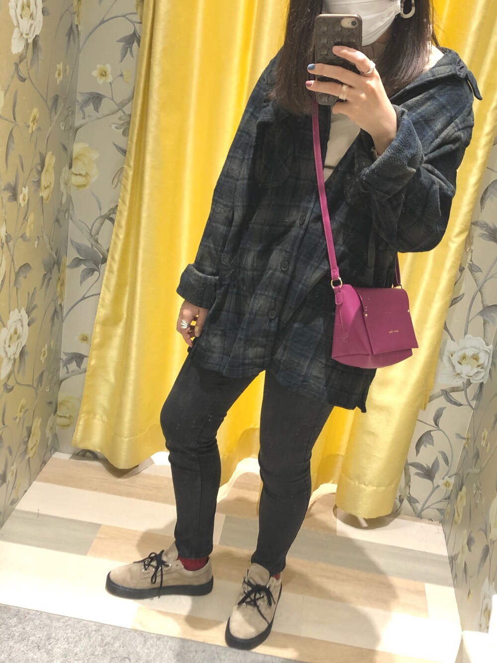 休日コーデ。 ビッグサイズのメンズのフリースシャツでアウターとしても着てます! このバッグ、すんごいお気に入り🌷