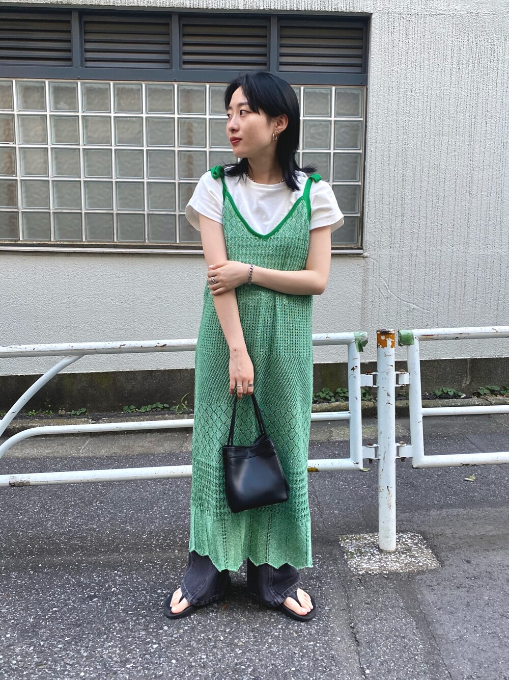 グリーンのニットキャミワンピ、 あみあみのデザインが可愛い◎ ブラック系のアイテムと合わせて 可愛くなりすぎないコーデを意識しました🌱
