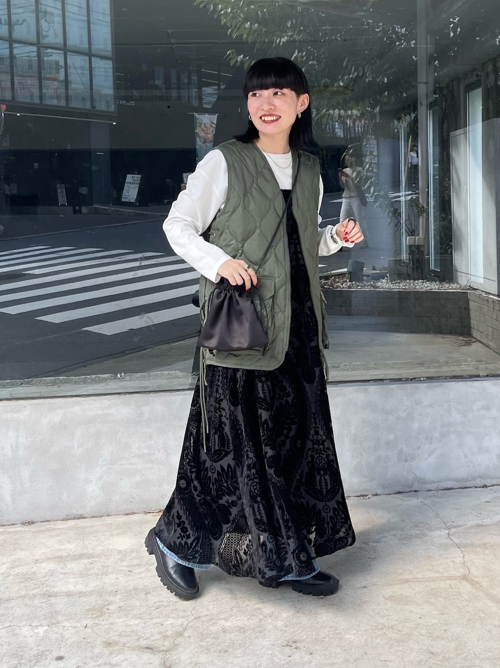 ワンピース×ベストのレイヤードコーデ TAIONのダウンベストは見た目以上の暖かさ 前開きで羽織れるのも便利です ワンピースはオケージョン対応も◎ Instagram→@99.974_2000
