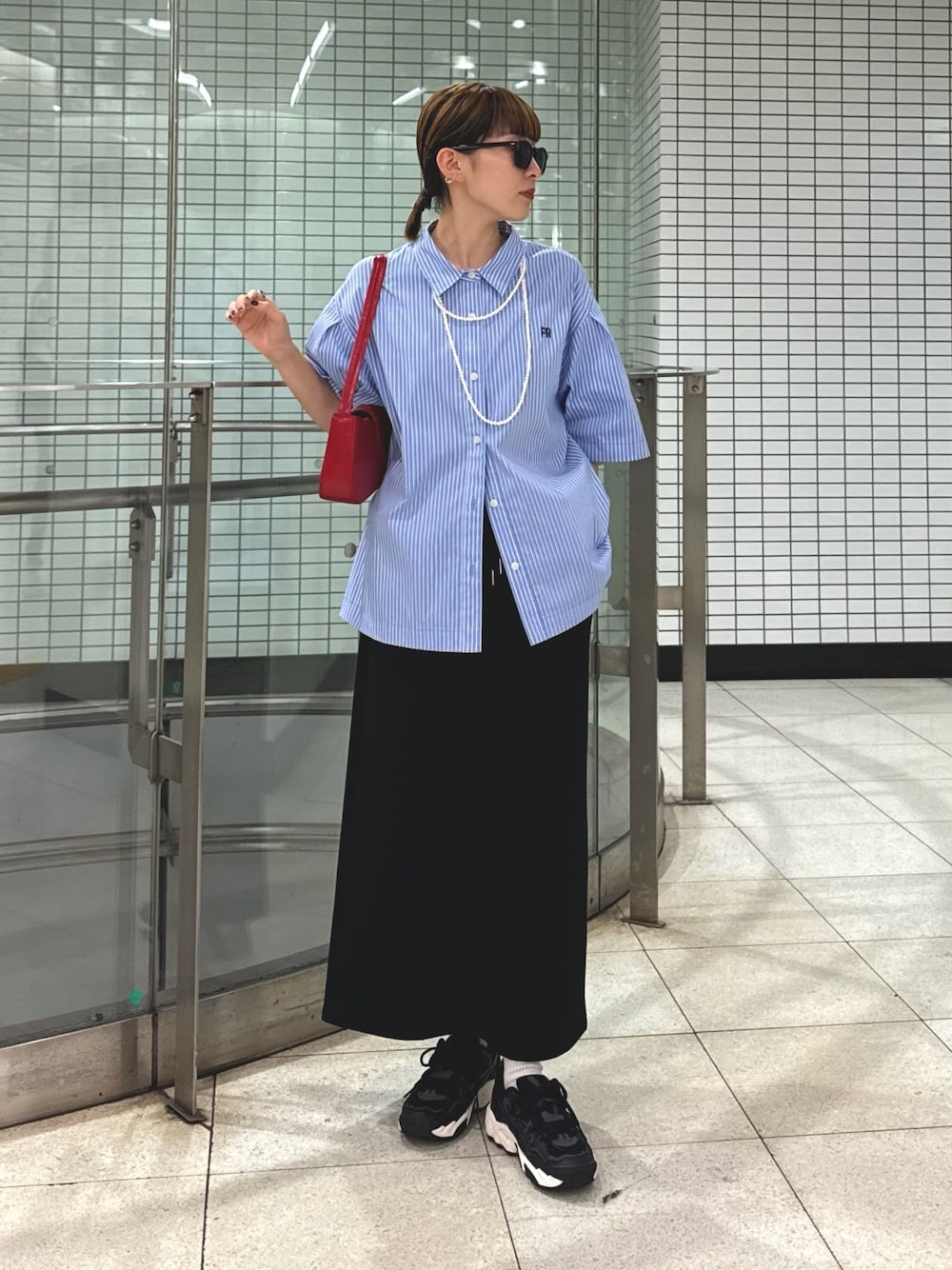 ブルーと赤のカラーリングがお気に入りのシャツコーデ シルエットのきれいなタイトスカートが大人っぽいスタイリングですが かなり伸縮性のある生地を使用したスカートなので履き心地はらくらく◎ 大人カジュアル見えする楽ちんコーデでもあります ウエスト部分もゴムと紐で調整がきくので沢山食べる予定の日にもストレスなく着用できます! シャツはゆったりめのサイズ感なので風の抜けがよく、 じめっとした気候の日にもおすすめです 前開けでさらっと羽織っても◎ シンプルなアイテム合わせなので 小物は華やかなものを選びました! 参考にしていただけると嬉しいです Instagram→@99.974_2000