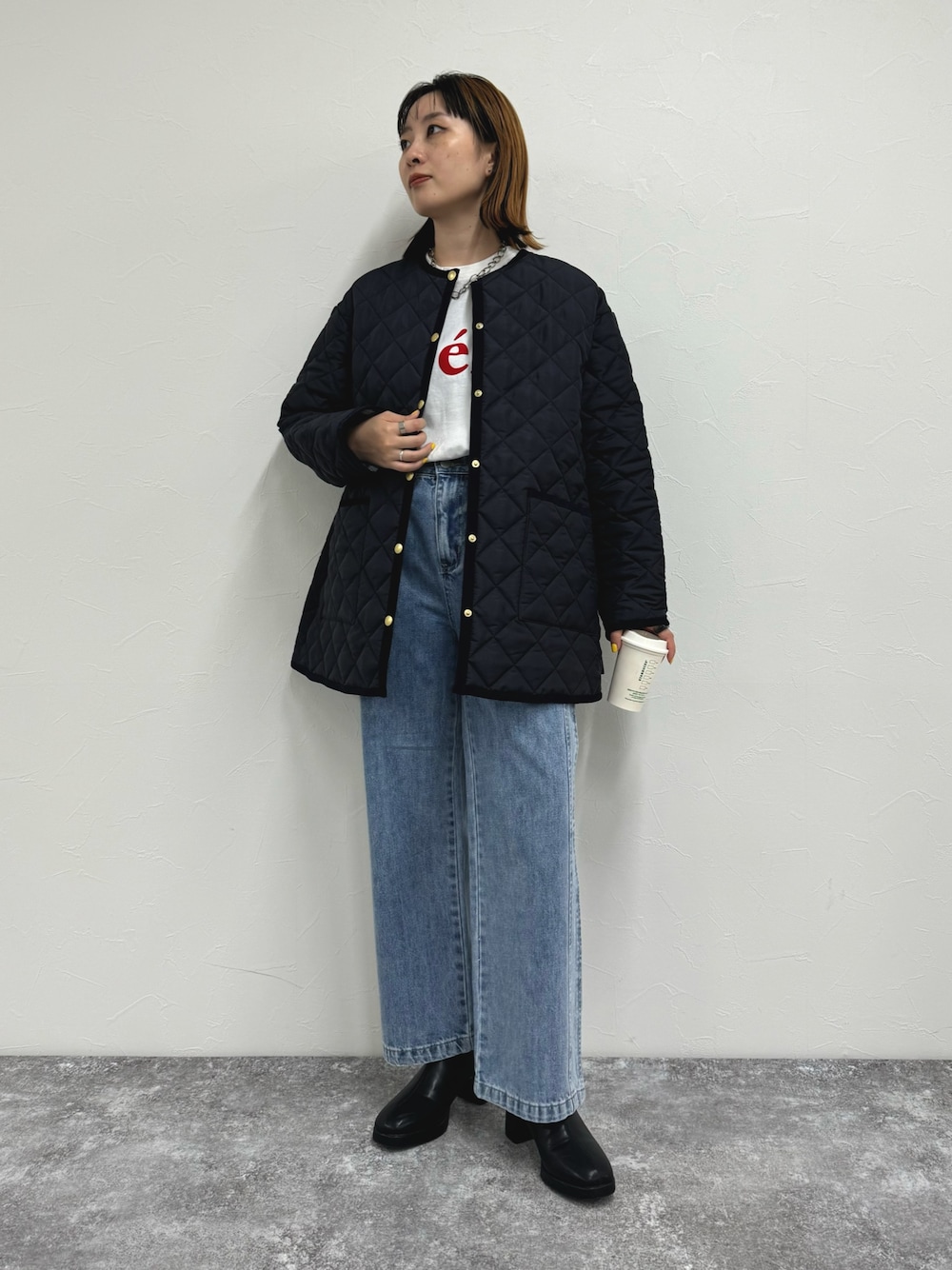 キルティングコートを主役にしたシンプルコーデです ・アウター traditional wetherwear × fredyの別注アイテム 品のあるデザインはもちろん、中綿で軽い羽織り心地も魅力です 裏地の細かいチェック柄生地が今年の別注ポイント! 昨年までのものと比べてサラッとした生地に変更したことで、 厚手のニットやスウェットの上にも羽織りやすくなっています カジュアルからキレイめまで幅広いシーンで長く使えるアイテムです ・デニムパンツ サイドの切り替えラインがさりげなくアクセントになるデニムパンツ ストンとおちるストレートなシルエットで脚長効果も◎ 155cmの私は32サイズ着用でジャストサイズでした! 参考にしていただけると嬉しいです Instagram→@99.974_2000