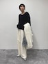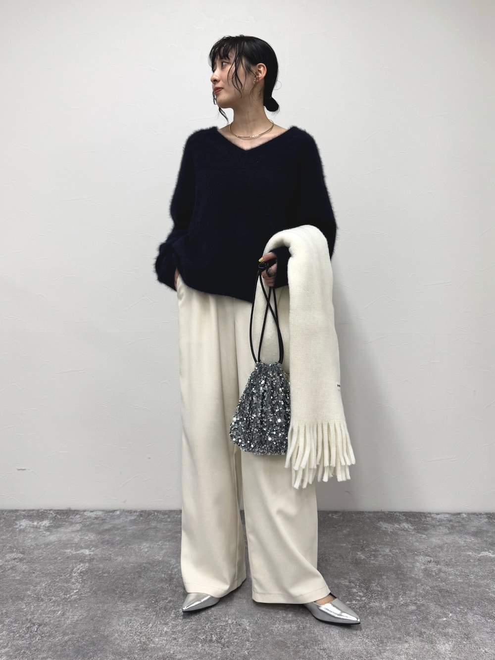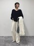 ・ニット FOX混でこれ一枚で暖かい!なふわふわニットです Vネックで首元がすっきりとしていて、ふわっとした質感ながら大人っぽい雰囲気で着用いただけます ネイビー×ホワイトの上品な印象が好きでこちらのカラーを着てみました◎ ・パンツ 起毛感のあるあたたかいイージーパンツです ホワイト系のパンツですが透け感はなく、ショート丈のニットとも合わせられるのが嬉しいです 落ち感のきれいなシルエットなので、らくちんな履き心地と綺麗見えどちらも叶えてくれます! 参考にしていただけると嬉しいです Instagram→@suda_mame3