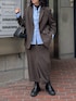 ・ジャケット ゆったりめのサイズ感がこなれ感のあるオーバージャケット 裏地付きでアウター感覚で羽織れるアイテムです 今季は黒のシンプルなボタンでより幅広いシーンでお使いいただけるように◎ インナー次第でロングシーズン使えて秋冬のワードローブになること間違いなし! ワンサイズでゆったりとした着用感、中にニットやパーカーも着込めそうです ・スカート ジャケットとセットアップで使えるタイトスカート ツイード生地で暖かく、秋冬と活躍しそうな1点です 膝上あたりまでツルッとした素材の裏地が付いていて、履き心地も◎ 深めのスリットはロングブーツやサイドゴアブーツとの相性抜群! 36サイズ着用で足首が少し見えるくらいのすっきりとした着用感でした 参考にしていただけると嬉しいです Instagram→@suda_mame3