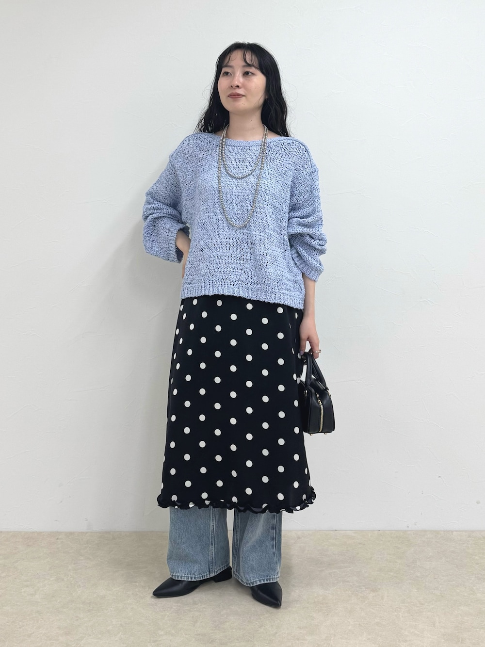 ・トップス 平編みのテープ糸を使用したぽこぽこ感の可愛い春ニット 肌触りもサラッとしていてタンクトップやキャミの上に一枚で着てもお使いいただけます 丈感がやや短めなので小柄な方にもおすすめしたい一枚で着映えするトップスです ・スカート いつものパンツに重ねるだけで一気にトレンド感のあるスタイリングに仕上がるアイテムです 裏地付きなのでもちろん一枚でも着用できて、着回しの幅も広がります 裾のぷりっとしたフリルがさりげなく可愛いポイントです! 春に着たくなる爽やかなブルーを甘すぎないトレンドスタイルでまとめてみました 参考にしていただけると嬉しいです Instagram→@suda_mame3
