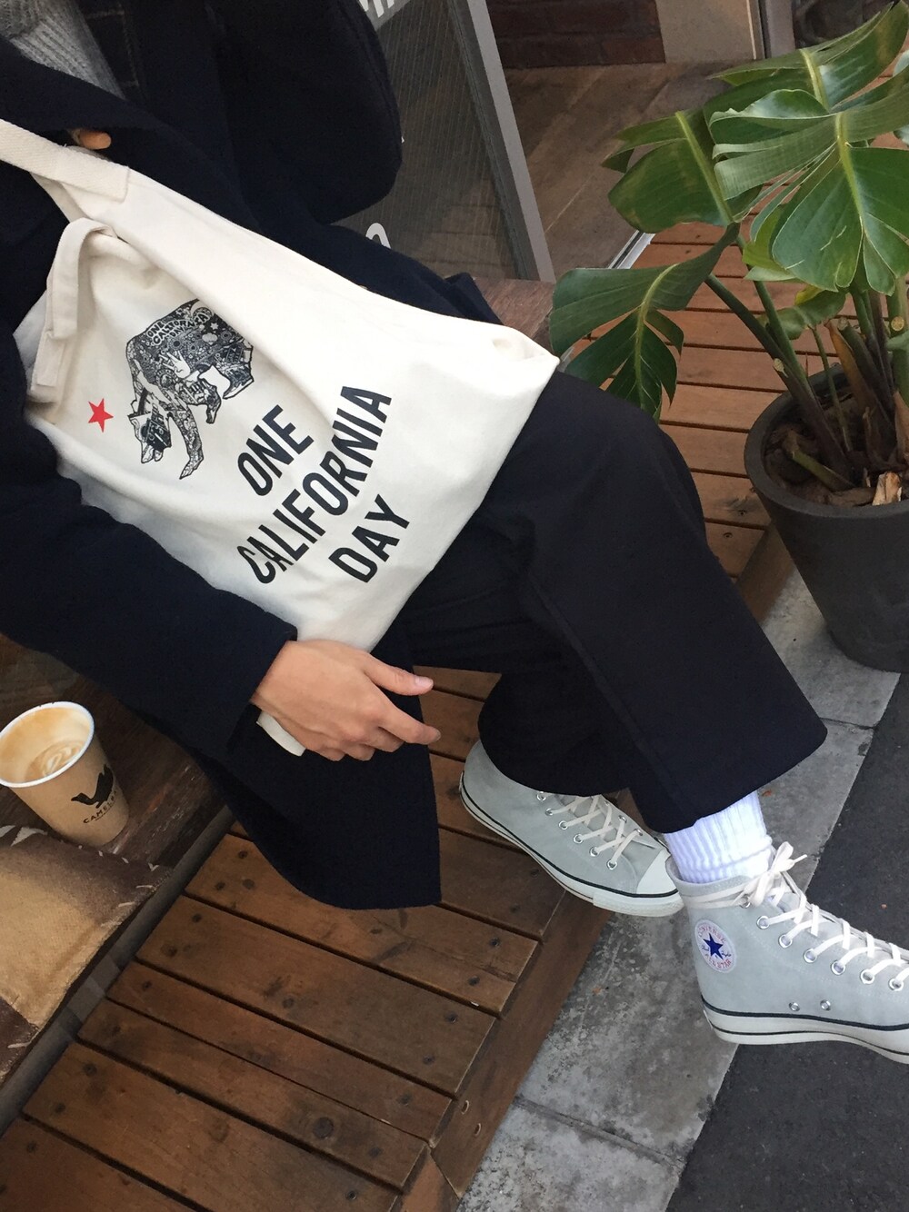 ホワイト系のトートバッグを着用したメンズの冬コーディネートの1枚目の写真