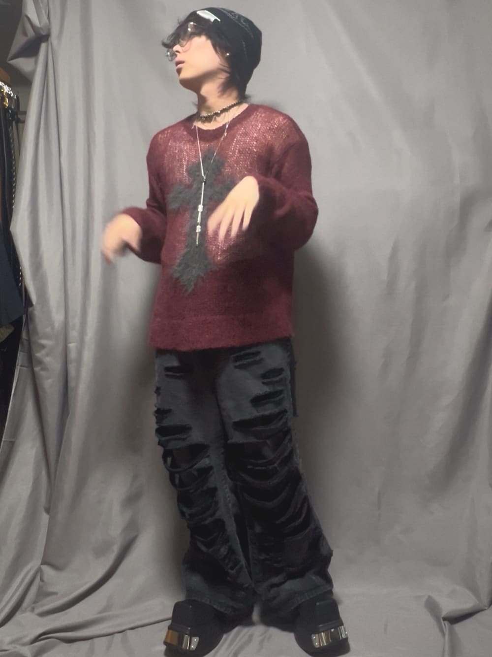 sumiiiiiのデニムパンツ「【GRANCY】Sweat Docking Design Damage Buggy Denim Pants / スウェットドッキングデザインダメージバギーデニムパンツ」を使ったコーディネート