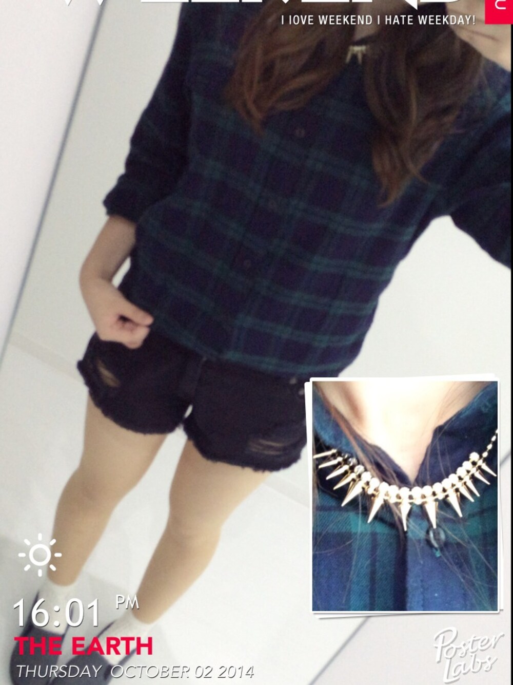好きなチェックシャツとゴールドアクセ、それにスリッポン。 好きなものコーデ。 これから先輩とご飯行きます(^ν^)