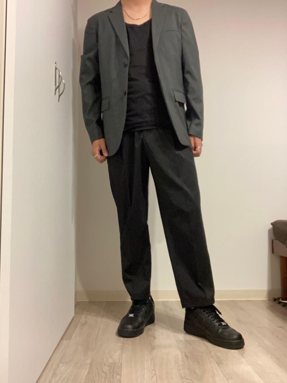 【本日のコーデ】 outer :UNIQLO(感動ジャケット) tops :UNIQLO(エアリズムコットンタンクトップ) pants:UNIQLO(タックテーパードパンツ) shoes:NIKE(Air Force 1) accessory:CLEL(ネックレス) accessory:MB(バングル) accessory:Burner(リング)