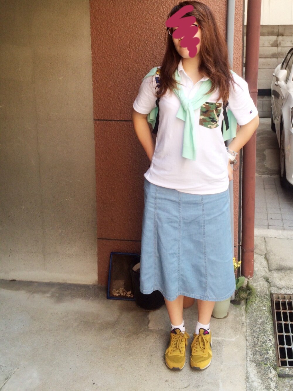 どもです!championのポロシャツメインでデニムのロンスカとあわせてみました🙆 それだけだとさみしいのでミントカラーのカーディガン🙆 足元はナイキでまとめました😂😂😂