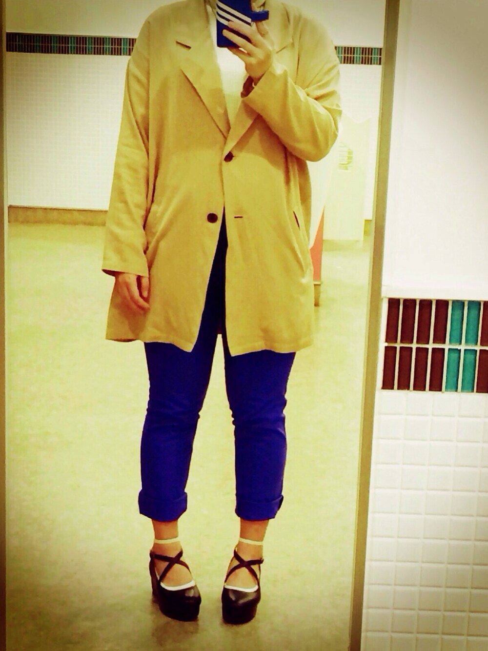 ビッグジャケットで体型カバーの着やせコーデです! 前のボタンは開けても閉めてもかわいいとおもいますが体型カバーしたかったので閉めました! ジャケットがベージュ、インナーが白、シューズが黒だったのでパンツはさし色でブルーにしてみました♪ このジャケットの長さだとお尻が隠れるのでその点もとっても嬉しいアイテムです!!! ビッグジャケット WEGO ハイネックセーター WEGO スキニーパンツ OLDNAVY シューズ earth music&ecology