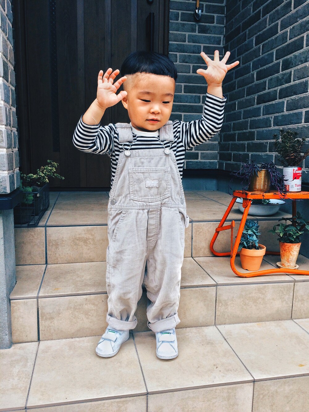 ホワイト系のスニーカー、ベージュ系のサロペット/オーバーオールを着用したキッズの秋コーディネートの1枚目の写真
