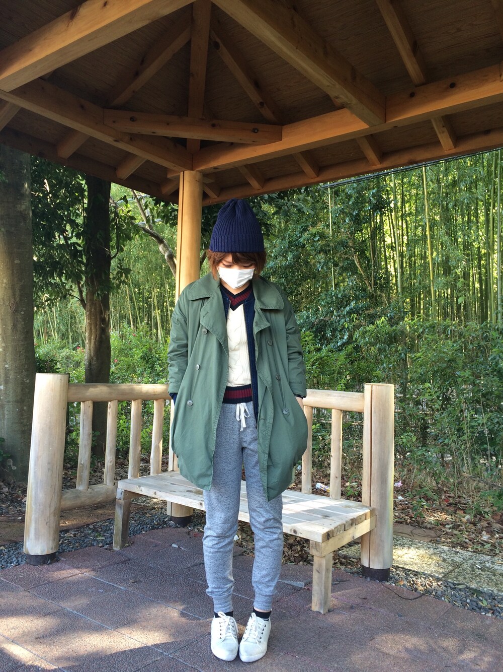 竹林をバックに。 トレンチの中にはデニムブルゾン仕込んでまふ
