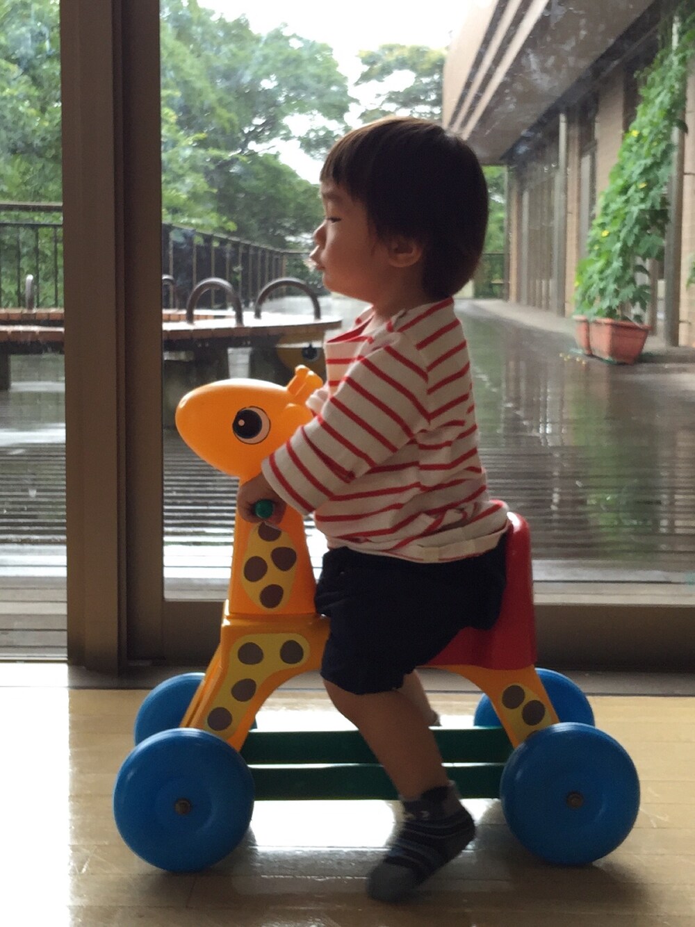 お久しぶりです! ボーダーは100cmサイズしか 残ってなかったんだけど、 そのうち着せようと買っておいたやつ〜 まだだいぶ大きいけど。 ボーダー夏フェスお邪魔します! 雨であまり外に出たくない時も 出かけないとグズグズで大変なので、 とりあえず駆け込み寺の児童館へ。 キリンで満喫してました🐱