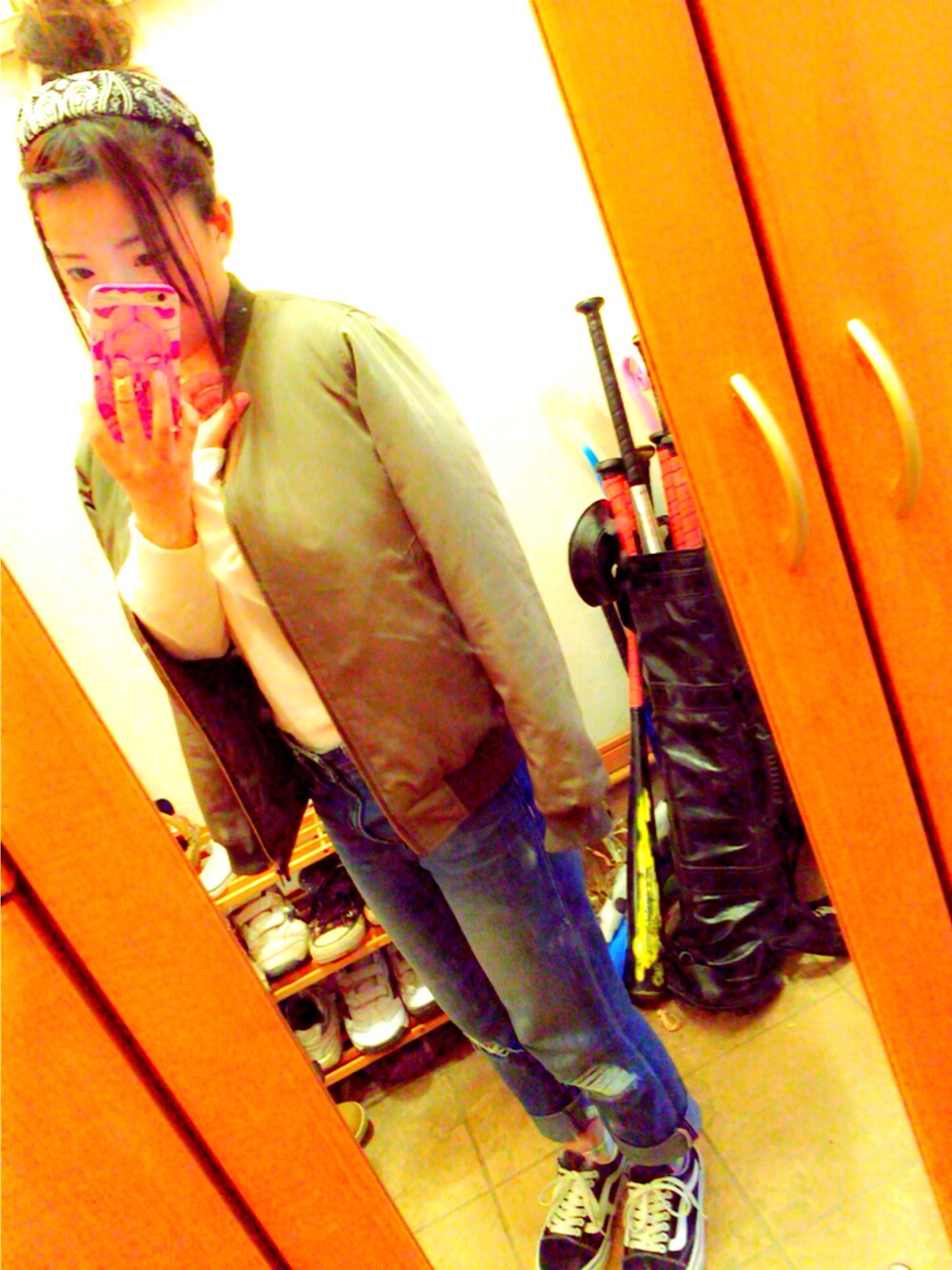 ちょっと前の。 前髪上げて団子は可愛いね☀︎ ちょっと寂しいのでアイテムでバンダナ巻いてる! ペイズリー柄大好き☁︎ バンズのスニーカーはやっと手に入れてから愛用中