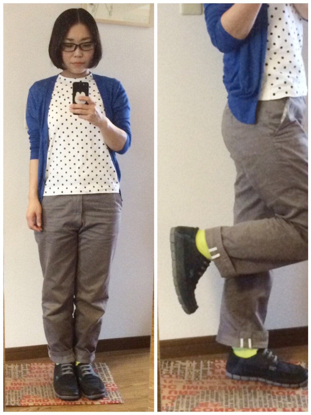 変なポーズしてるのは、ソックスの黄色が見えないから。 前身頃だけプリントの水玉Tは、久々に登場。 20150605