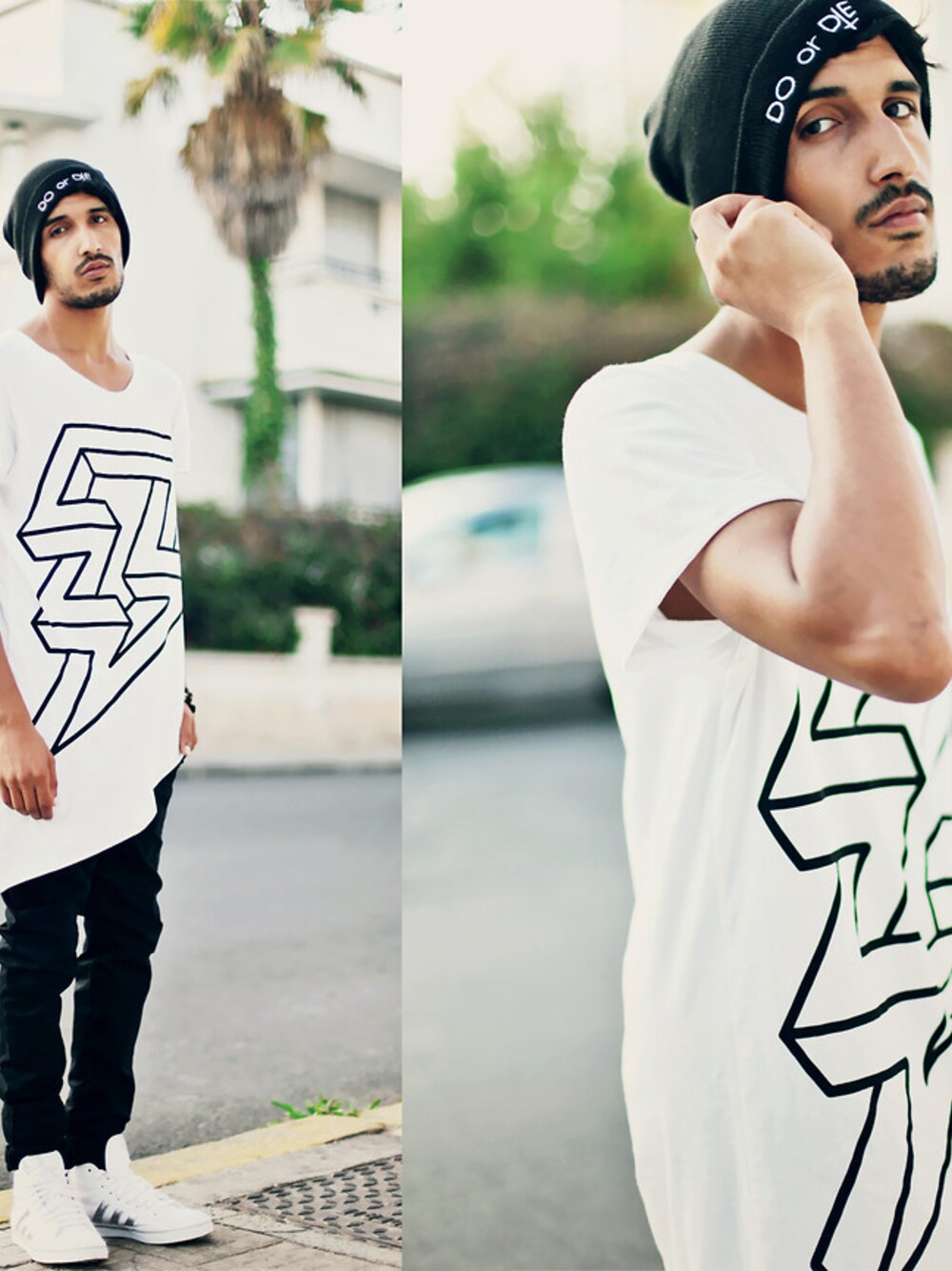 Mohcine Aoki wearing a Nemis Asymmetric Lightning Tee