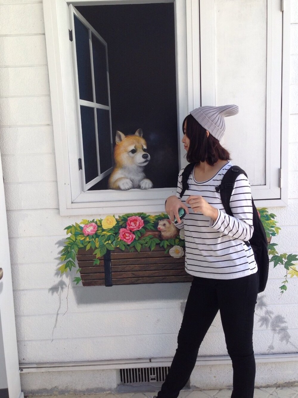 ニット帽:g.u. トップス:韓国 パンツ:g.u. 那須トリックアートに行った時の 写真です。ワンちゃんの顔が かわいくて癒された。