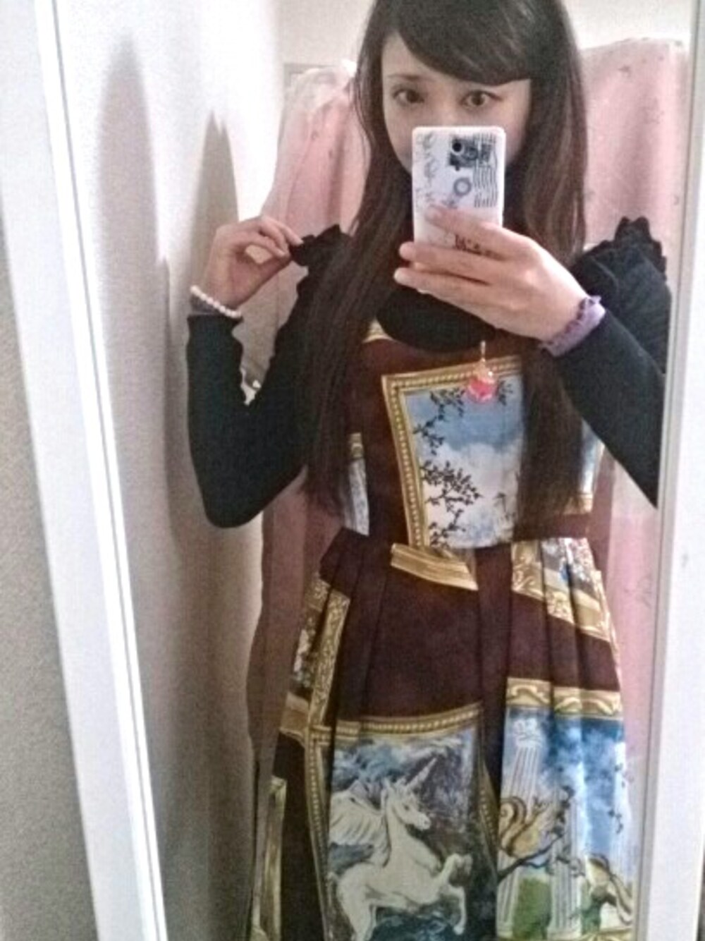 ブラウンっぽいボルドー 色が鮮明には判らないことが多いので、私にはそう見えて、これは好きな色。 額縁に飾られた絵 こどもっぽくないタッチなので大丈夫かなと思って着ています。 でも裏地はスカートの裾の下の方に女の子らしいタックが入れてあります。ふんわりとする。 一角獣がいます。
