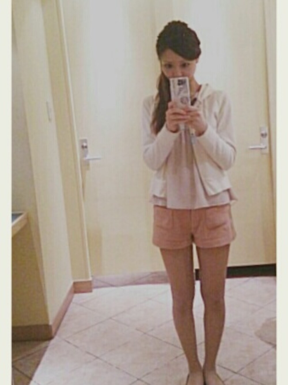 サーモンピンクのショートパンツ ふわふわした厚手の生地で、穿けるのは春先、秋、冬の初め。
