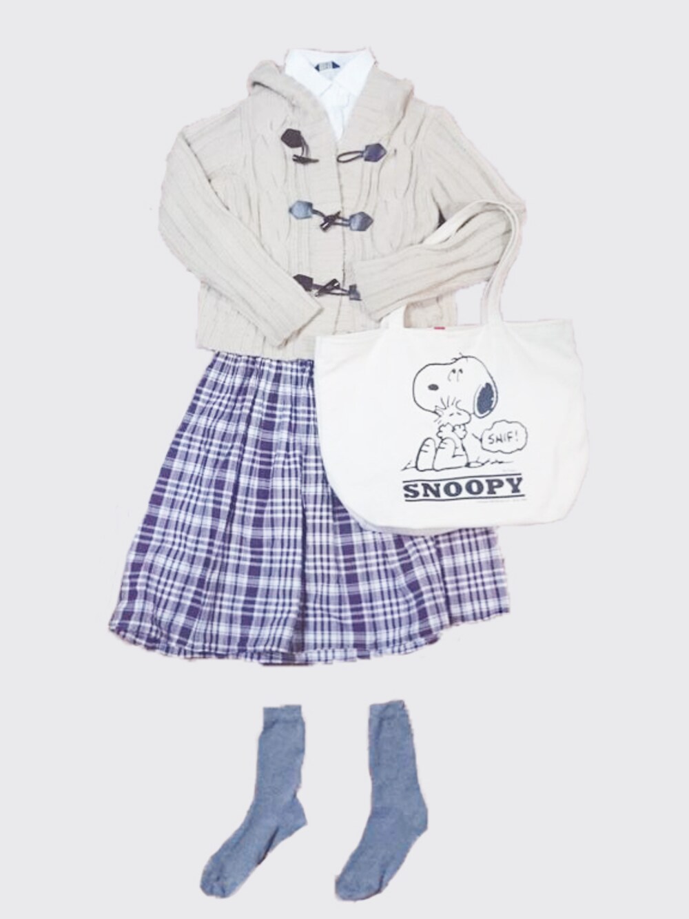 こんばんは。 見直したところ、いつも文章が長めなので できるだけシンプルにまとめようと思います!(・・;)笑 ダッフルのニットは小学生の時に母が買ってくれました。 今確認したところ、おそらくHoneysのCINEMA CULBです。 7年もたつと毛玉がすごいですが、毎年大事に着ています(。・ω・。) 中に着ているシャツはEAST BOYです。 小学生の時に姉がプレゼントしてくれました。 生地が薄めなので春や夏にぴったりのシャツです(o・・o) スカートは通販のhaco.で購入しました。 生地は薄めなので、タイツを穿いたり他のスカートを重ねたりしています。 春夏秋冬穿けるので、お気に入りです(*´∀`*) スヌーピーのトートバッグはUNIQLOです。 色も生地もデザインも素敵なので、できるだけ汚れないよう大事に使っています(*`・ω・´) 靴下はGUです(・・*)