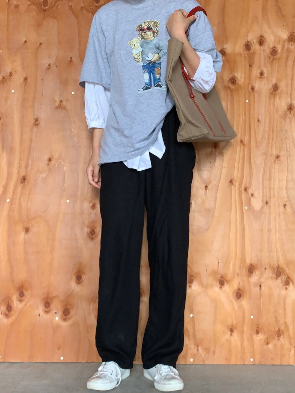 T シャツにパンツだとシンプル過ぎるので、GUのリネンシャツを中に着てレイヤードにしました😊シャツは7分丈で薄い素材なので、重ねてもそこまで暑くないです👍