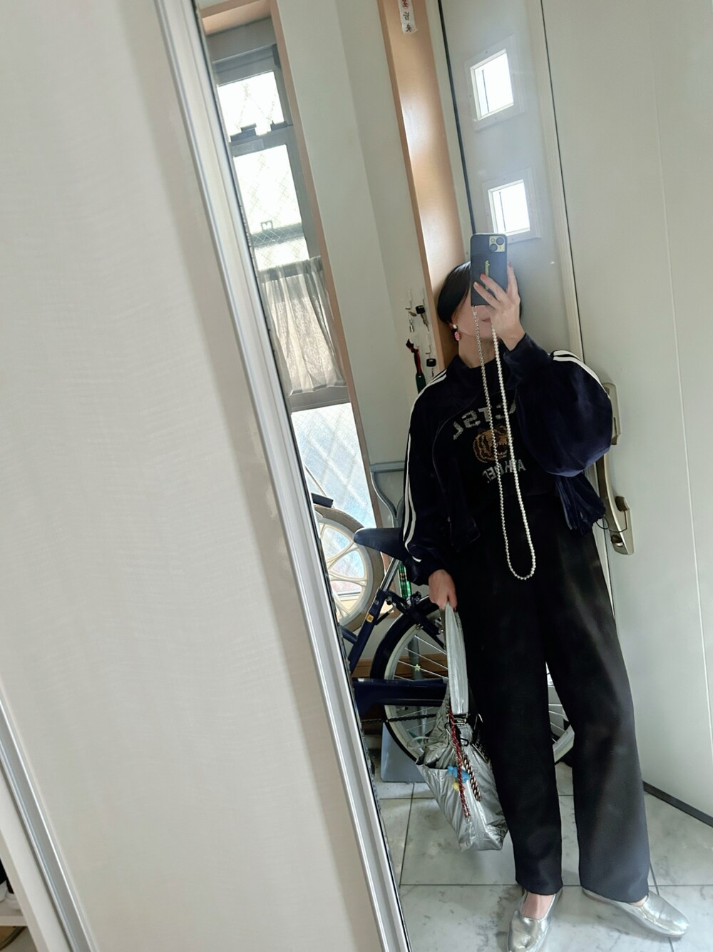 ネイビーが最近気になるー ベロアアウターもネイビーでスポーティなラインが袖に入ってて好み‼️