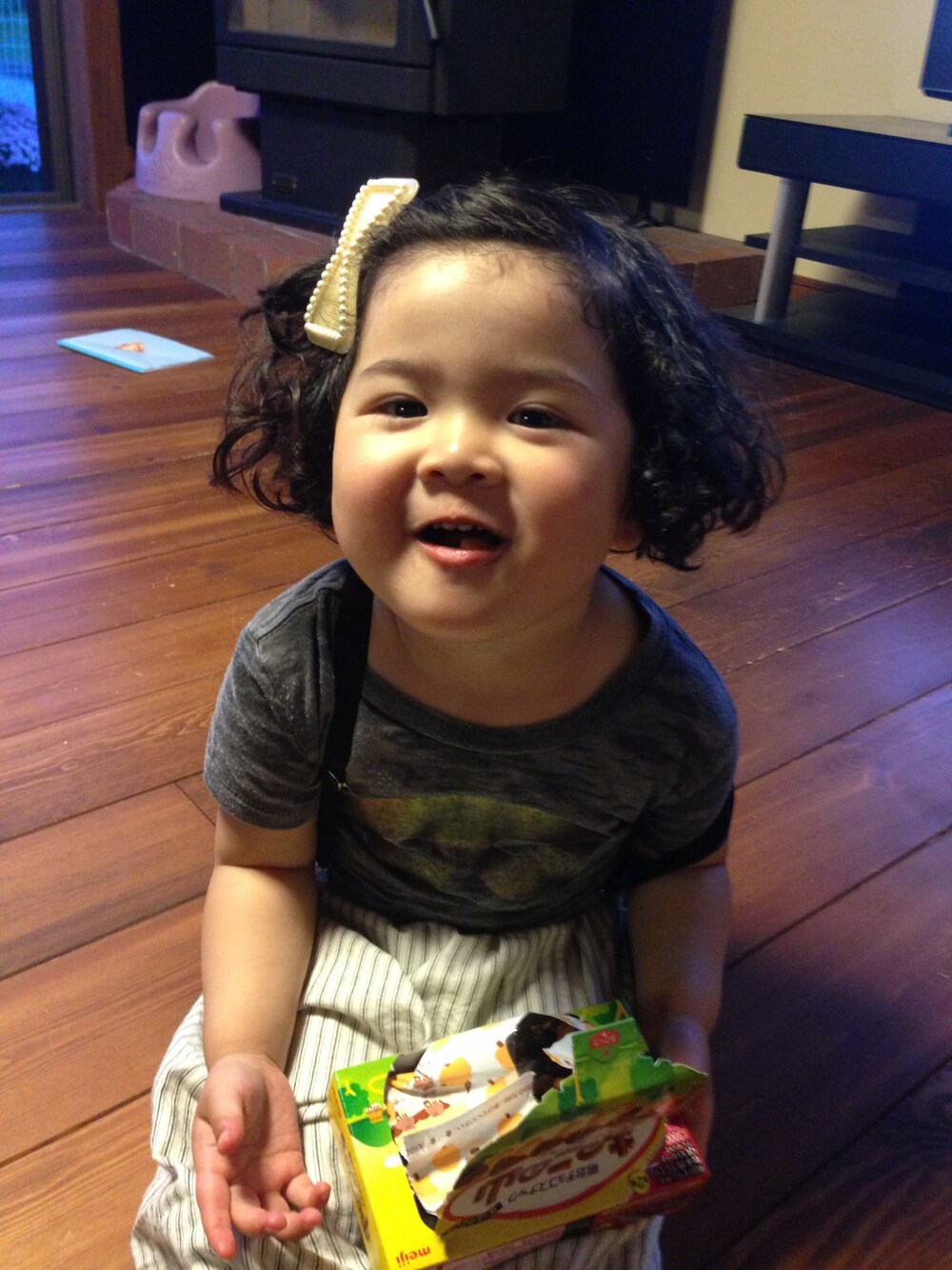 トップス…不明 ボトムス…韓国服 サスペンダー…西松屋 今日はあついー‼ きのこの山をほうばる娘。。。